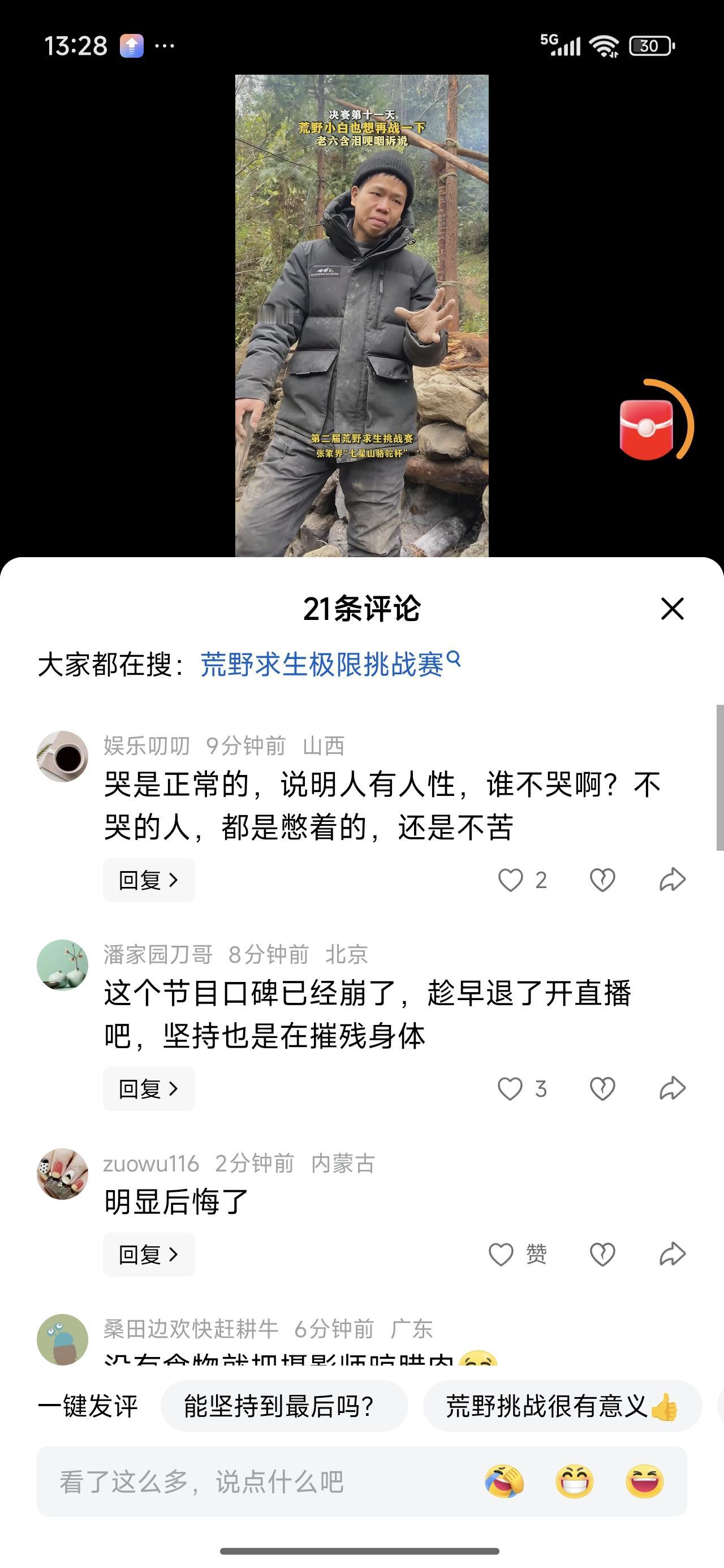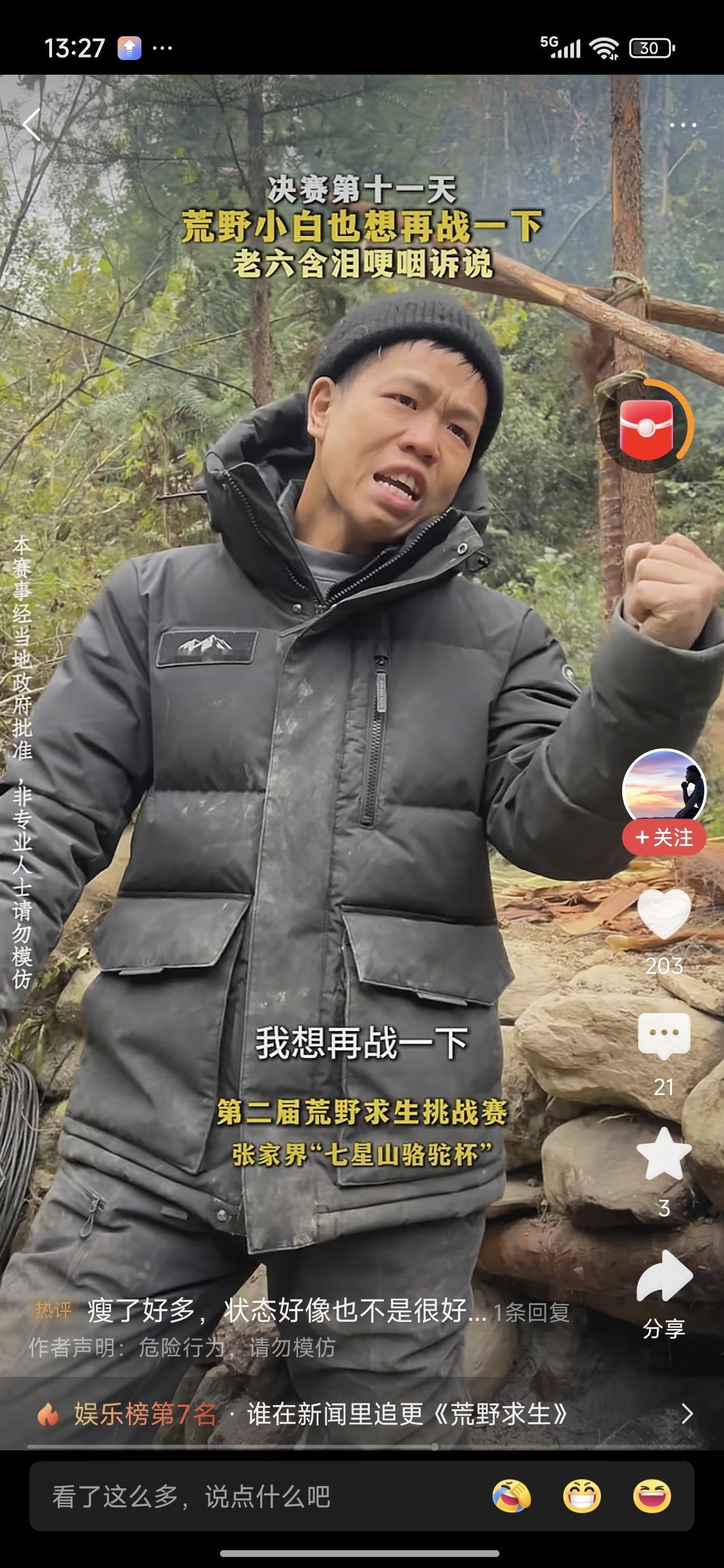 老六已经后悔了!说昨天他就让他退赛的,这个他应该是他老婆。 没有人比老婆孩子看到男人爸爸一天到晚在吃草来的心疼。可是他不甘心。说白了,眼泪是正常的,但眼泪也代表着后悔了。还想再玩一下。老六啊,这时候,每延长一天耗得精气血都是巨大的。 不值当啊!回来直播吧,毕竟,大伙儿手里的子弹就这么多,今天刷了,脑子一热,兴许就all in了。这玩儿容易上头。毕竟每个人都有故事,都有闪光点。谁提前迸发,谁就有流量,收礼物。张老六 晚了真不好说。不知谁能传达一下这个意思,熬下去,又一个十天。那是熬命啊!第一就一个,建哥吧,苗王第二。剩下的,都差不多。