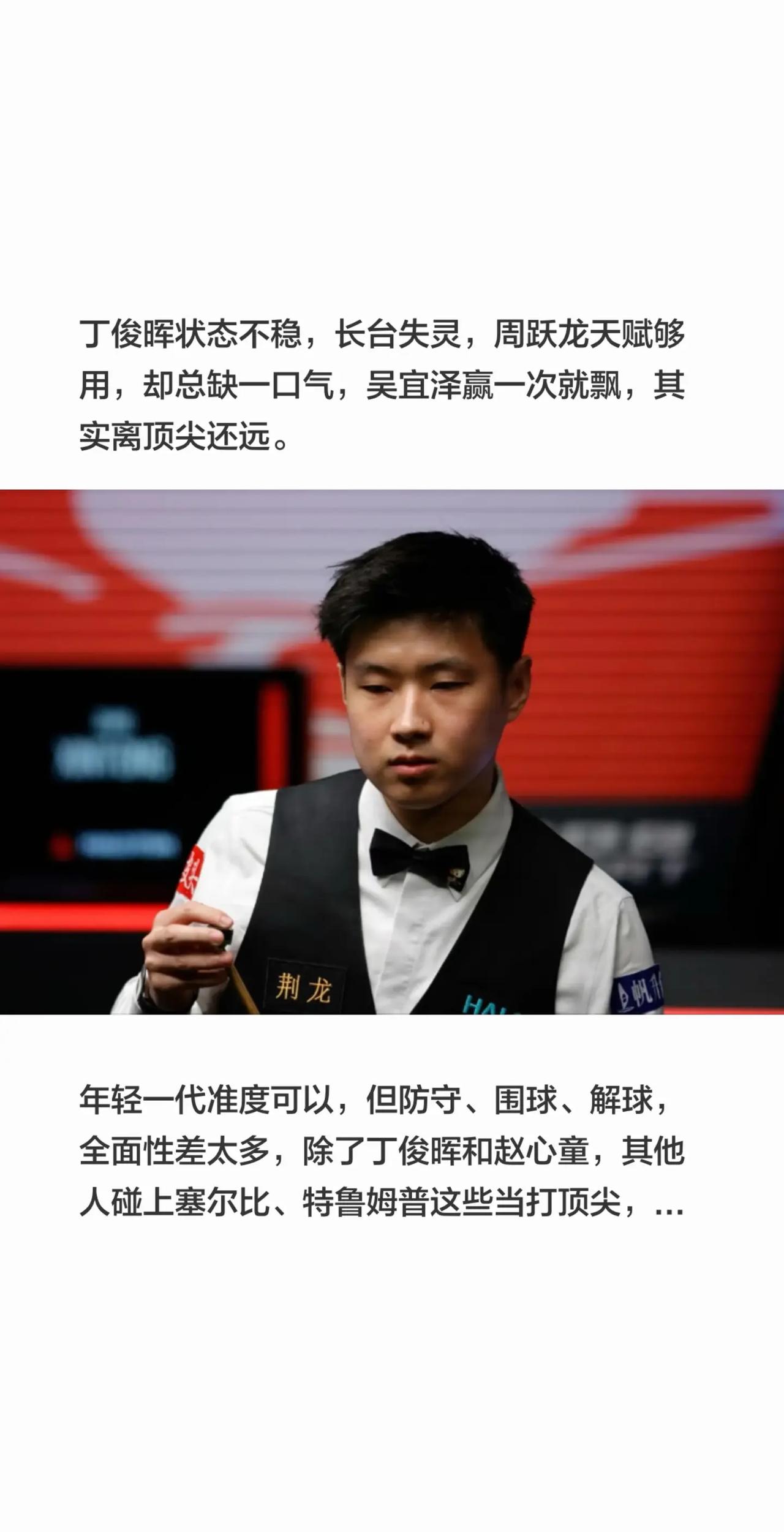 目前中国斯诺克,能扛旗的还得看赵心童!丁俊晖状态不稳,长台失灵,周跃龙天赋够用,却总缺一口气,吴宜泽赢一次就飘,其实离顶尖还远。年轻一代准度可以,但防守、围球、解球,全面性差太多,除了丁俊晖和赵心童,其他人碰上塞尔比、特鲁姆普这些当打顶尖,长局制基本没戏,也就趁“75三杰”年纪大了,偶尔能赢。中国球员普遍心理素质不过关,一打硬仗就手紧,简单球失误、解球失误频发,脸上都写着畏缩,这毛病不解决,技术再练也白搭。他们打球太依赖准星,一旦不准就不会玩了,丁俊晖年轻时也准,但人家练出了走位和防守,现在这批人,母球控制粗糙,防守漏洞大,给对手留的机会太多。说到底,基本功不扎实,大赛经验又少,输几局就垮,斗志全无,人数不少,能稳定输出的没几个。未来想突破,赵心童得把防守练稳,其他人更要埋头补课——走位、防守、心理,一样不能少,路还长,但至少现在冲击顶尖的场面多了,也算一点希望。