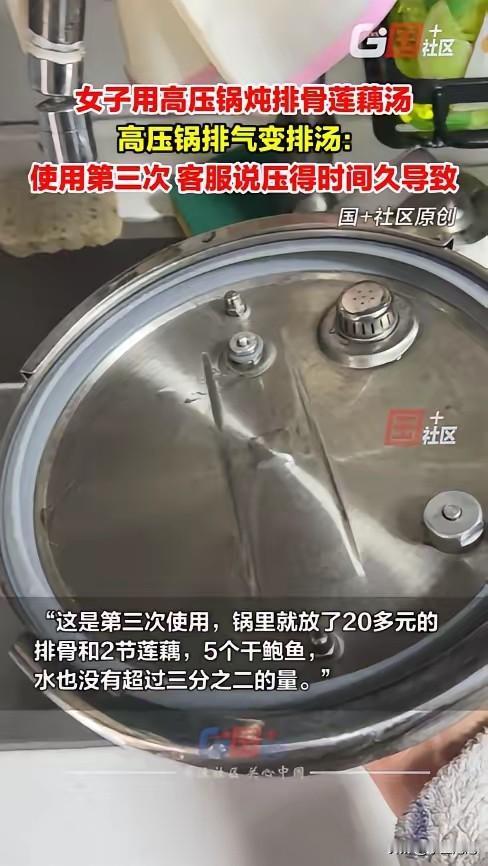 “太吓人了!”近日,四川内江,一女子用高压锅炖排骨,泄气后又放了莲藕炖了10分钟,可等她再泄气时,排气孔中喷出的却是汤水!油烟机、灶台、地面,全都是白色的排骨汤,把女子吓得撒腿就跑。网友:炖的时间太长了! 你想啊,好好一锅排骨莲藕汤,还没来得及盛到碗里,就从高压锅的排气孔里喷出来了,像个小喷泉似的。白花花的汤混着藕片碎渣,流得到处都是——油烟机上、橱柜门上,连瓷砖缝里都沾着肉渣。那女的后来跟人说,当时吓得脚都软了,后背还能感觉到汤雾的热气,以为锅要炸了,心脏跳得特别快,赶紧跑到客厅躲着。 这事儿发到网上,好多人讨论。有人说肯定是水放多了,也有人说这锅才用第三次就出问题,质量肯定不行。商家客服说,是炖的时间太长了,排骨只需要炖15到20分钟,她炖了20分钟排骨又加10分钟莲藕,一共30分钟,所以才会这样。 我问了一个做了十年饭的厨师朋友,他说,炖久个十分钟顶多肉更烂一点,不可能把汤喷出来。要么是密封圈没装好,要么是排气阀堵了,再不然就是锅本身有毛病。新锅才用第三次就喷汤,绝对不是“炖久了”这么简单。 那女的买这锅就是图省时间,想着炖肉香,哪知道会被一锅汤吓得躲出去。她拍的视频里,灶台的台面被汤泡得黏糊糊的,防烫套上还挂着一块藕。有网友说,自家高压锅之前也出过这事儿,排气阀堵了,盖子被顶起来两厘米,汤溅了一墙,到现在墙上还有黄印子。 很多人碰到这种事,第一反应都是“是不是我哪里弄错了”,不会想到是锅的问题。商家一句“炖久了”,就把锅的质量问题绕过去了,但谁也没给那被吓得腿软的女的一个说法。到底是炖久了的事儿,还是新锅本身密封有问题? 现在好多人家用高压锅都遇到过类似的情况,大多都觉得是自己没弄对,很少会怀疑锅的质量。其实品牌方应该好好查一查,看看是不是设计或者做工有问题,不能一上来就说是用户的错。 你家的高压锅有没有过排气不顺畅的时候?有没有遇到过喷汤这种事儿?还是真的因为炖太久出过状况?可以在评论区说说,大家一起聊聊高压锅这东西到底安不安全。 ​信息来源:《11月27日(采访时间),四川内江。女子用高压锅炖排骨莲藕汤,高压锅排气变排汤:水没有超过三分之二的量,客服说压得时间久导致。提醒大家使用高压锅时注意。》国+社区