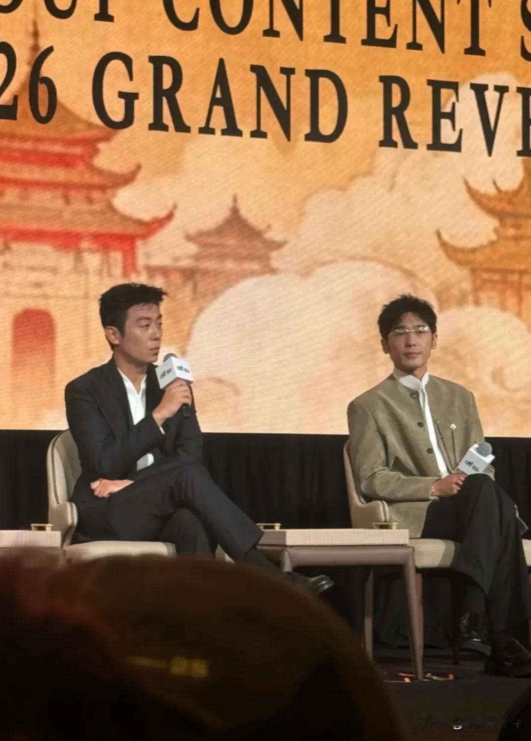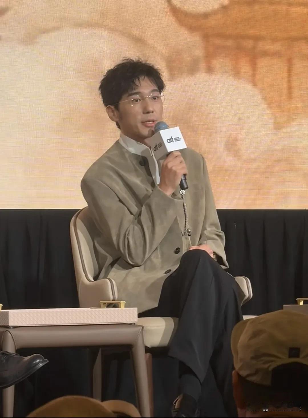 朱亚文和白宇现身新加坡新片《太平年》路演。 白宇穿着一件青灰色圆领外套,戴着眼镜