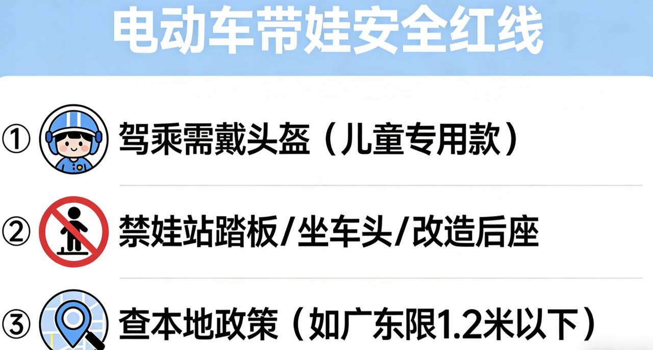 2025电动车带娃新规!绿牌/蓝牌/黄牌规矩大不同,搞错罚款又危险 家人们别瞎带娃了!2025电动车新国标过渡期结束,带娃不是“一刀切”,但牌照不同、年龄不同,规矩差超多,记错真会被罚~ 核心结论先拎清:能带我,但有硬要求! ✅ 绿牌(电动自行车):全国通用可载1名12岁以下娃,6岁以下必须装3C认证安全座椅;北京、江苏等10省市已放宽到16岁(覆盖初中生),但绝对不能载成年人! ❌ 蓝牌(电动轻便摩托):严禁载人!哪怕抱在怀里的婴儿也不行,违规罚200元左右还可能扣车。 ⚠️ 黄牌(电动摩托):能载1人,但必须有E/D证+交强险,且严禁带12岁以下儿童,违者罚款扣分。 关键安全红线: 1. 无论啥车型,驾乘都得戴头盔(儿童用专用款,别用成人头盔); ​ 2. 严禁娃站踏板、坐车头,也不能私自改装加宽后座; ​ 3. 各地政策有差异,出门前最好查下本地最新要求(比如广东部分地区限1.2米以下娃)。 交警数据说话:儿童电动车伤亡事故中,75%和未戴头盔、没装安全座椅有关!新规不是限制,是给娃的安全兜底~ 你家电动车是啥牌照?带娃时踩过哪些坑?评论区聊聊~ 电动车 电动车新规有哪些具体内容? 交通