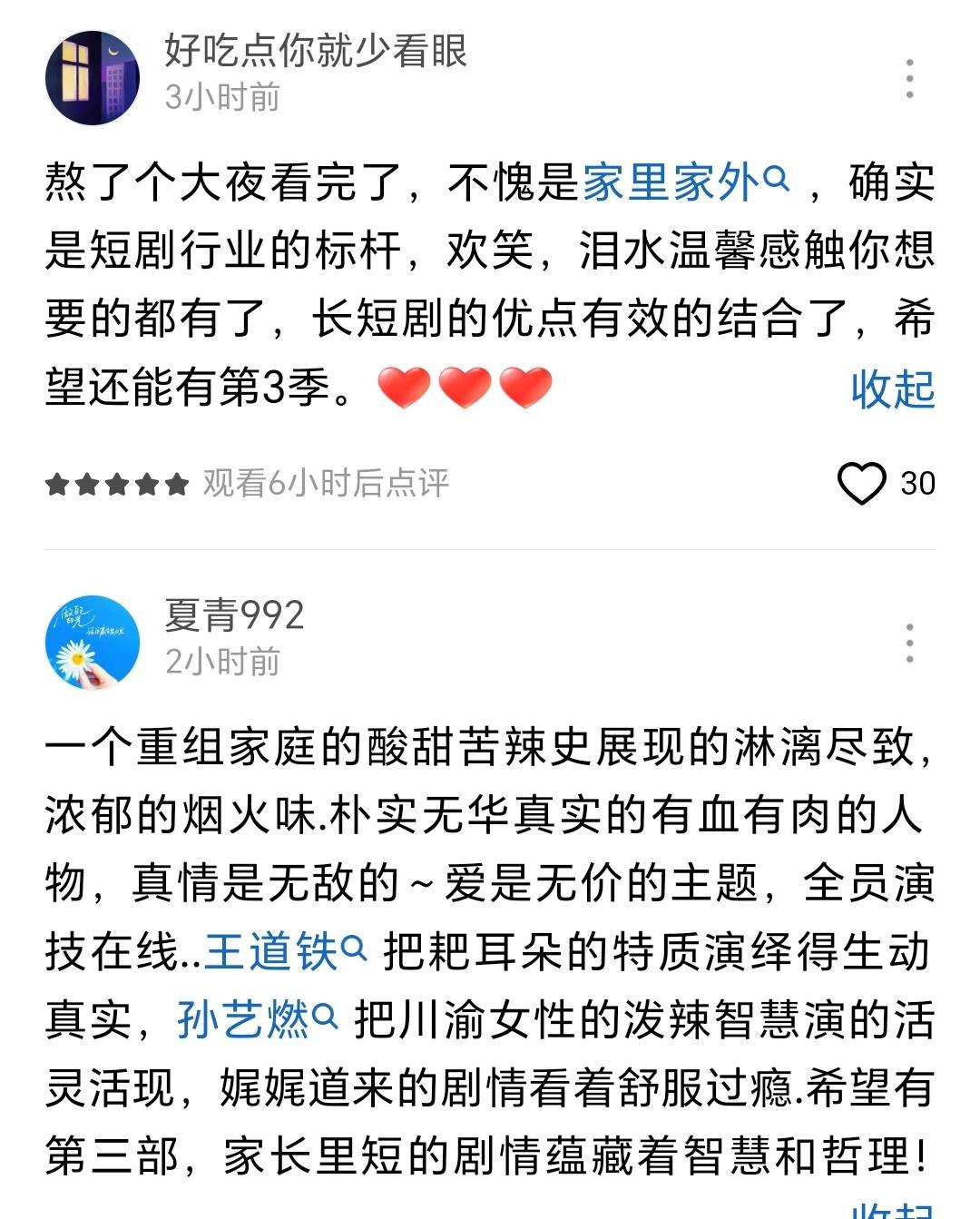 #家里家外2温暖内核#【笑中带泪、充满烟火味……《家里家外2》开播就上热搜】#观众点评家里家外2# 12月4日,在四川立项、成都拍摄的现象级微短剧《家里家外》续作——《家里家外2》上线,开播后迅速在网络掀起热议,家里家外2的相关词条登上热搜。不少观众点赞“笑中带泪”、“充满生活烟火味”,感叹“生活就是这样有苦有笑”。新一季的故事里,陈海清和蔡晓艳一家不仅迎来了新生命,也增添了更多性格鲜明的亲戚朋友邻里,但“充满变化的年代,不变的家人和爱”这一温暖内核依然不变。剧集播出后,观众反响热烈。众多网友留言表示,该剧精准捕捉了平凡生活的酸甜苦辣,既有鸡飞狗跳的闹腾,也有苦尽甘来的欢笑,“是让人边看边笑、笑中带泪的好作品”。据悉,相较于第一部,《家里家外2》在人物刻画上更为丰富立体,新增了十多位各具特色的角色:如热情爽朗又有学识的四川嬢嬢李老师,从北京来川生活的单纯热心小伙周大为,善良且气场强大的谢桂枝等,为这个家庭的故事增添了更广阔的邻里社会背景和人情味。值得一提的是,该剧一共111集,每集时长从2分多到5分多不等,总时长超过4个小时,已经超过大部分总长100多分钟的微短剧。该剧出品方听花岛相关负责人告诉红星新闻记者,此次《家里家外2》在长度上做了一次创新和挑战。当下的微短剧正在升级,所谓的短,并不是长度上的短,而是浓缩、脱水和倍速。短,是指高密度,要在情绪密度、信息密度、情节密度上做到高浓缩,观众才愿意看。网页链接