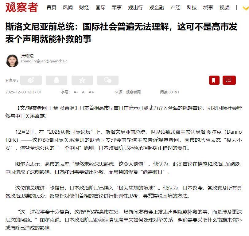 事情发展到今天这个地步,已经不是高市早苗发声明道歉就可以解决的了!12月2日在“2025从都国际论坛”上,斯洛文尼亚前总统达尼洛·图尔克直言:高市这表态“太不妥当”,违背了全世界都认的“一个中国”原则,日本政界必须出来纠正这个错误。图尔克还说,高市这话明显没经过脑子,让人遗憾,不管是情感上还是政治上都深深伤害了中国,日方早晚得补救,但要修复这局面,“还得等挺久”。 说句实在话,图尔克总统这话戳中了要害。国际社会之所以看不懂高市为啥说这话,核心就是她这话既不合历史法理,又不顾现实利益,还坏了国际规矩,造成的伤害根本不是发个轻飘飘的声明就能抹平的。 先从最根本的历史和法理上说,台湾是中国的一部分,这不是中国自说自话,有实打实的国际文件和历史事实撑着。 1943年中美英三国的《开罗宣言》就明明白白写着,日本抢的中国领土,包括台湾和澎湖列岛,都得还回来。 1945年《波茨坦公告》又重申了这一点,后来日本投降签字,也承诺会照做。 1971年联合国大会2758号决议更是一锤定音,承认了中华人民共和国的代表权,等于认可台湾是中国的一部分。 更关键的是,日本自己也白纸黑字承诺过尊重一个中国原则。1972年中日建交的《中日联合声明》,还有之后的三个政治文件,都写着日本承认中华人民共和国是中国唯一合法政府,也理解并尊重台湾是中国领土的一部分。 这些文件是有国际法效力的国家承诺,就像两国交往的“保证书”,现在高市一句话就想把这“保证书”当废纸,这在国际上最招人反感。 就像邻居签了协议划好边界,一方突然说协议不算数,还拿着棍子站到你家门口,换谁能接受? 连日本前首相石破茂都看不下去了,直言1972年中日邦交正常化后,历届政府都尊重一个中国原则,这是不能变的,高市这做法完全是跟历史对着干。 再说说实际影响,高市这不负责任的话,已经让中日经济吃了实实在在的亏,这可不是发个声明就能补回来的。 大家都知道,中日是全球第二和第四大经济体,经济早就绑在一起了。2024年两国贸易额有3083亿美元,中国连续16年是日本最大贸易伙伴,日本也是中国重要的贸易对象。 但她发表涉台言论后,情况立马变了。就说旅游,中国游客占日本入境消费的30%,现在因为关系紧张,去日本的中国游客少了很多。 日本经济学家算过,这可能让日本每年少赚2.2万亿日元旅游收入,还会拉低GDP大概0.36个百分点。 不光旅游受影响,日本消费股也跟着倒霉。11月中旬两天,三越伊势丹百货股价跌了12%,资生堂跌了9%,东证旅游指数两天跌了14%,这都是真金白银的损失。 反过来,日本企业对华投资也受了影响,虽然今年前9个月还有增长,但高端制造领域的合作已经停住了。更关键的是,两国产业链相互依赖,日本新能源汽车产业85%的稀土都从中国进口,中国也需要日本的一些电子零部件。 要是紧张局势一直持续,最后坑的还是两国企业和老百姓。这些损失,靠高市发个声明就能让股市涨回来、游客再去日本吗?显然不可能。 国际社会最不能接受的,是高市这话严重破坏了二战后的国际秩序,还碰了国际法的红线。 图尔克总统当过联合国安理会轮值主席,最清楚国际关系的基本规矩,尊重各国主权和领土完整,不干涉他国内政。 而台湾问题是中国的内政,这是全世界的共识,高市暗示要武力介入,说白了就是想干涉中国内政,跟《联合国宪章》的精神完全反着来。 更危险的是,她还拿日本新安保法当借口,把“台湾有事”和日本的“存亡危机事态”绑在一起,其实就是想帮日本突破和平宪法、扩军。 二战后日本的和平宪法明确规定放弃战争、不保留军事力量,但这些年日本右翼总想着钻和平宪法的空子。 高市这话就是在延续这种危险的想法,国际社会都看在眼里、急在心里。欧洲议会议员卡特日娜·科内奇纳直言,高市这错误言论是大问题,威胁世界和平稳定。 俄罗斯外交部副部长也批评这种挑衅政策不负责任;柬埔寨还直接发声明,重申支持一个中国原则。 这些国际声音都说明,不认同高市做法的是大多数,她这话没得到任何支持,反而让日本在国际上丢了信誉。