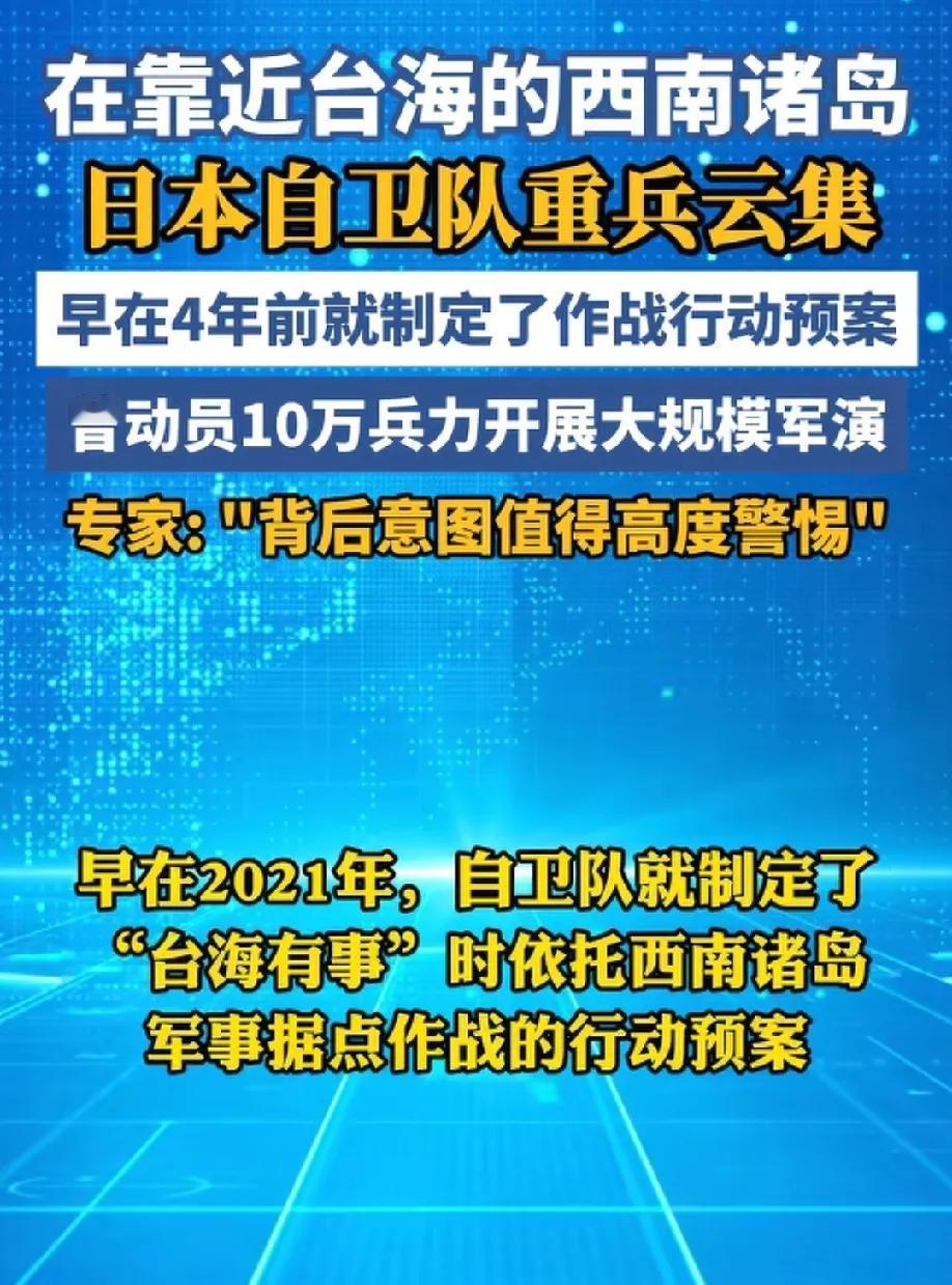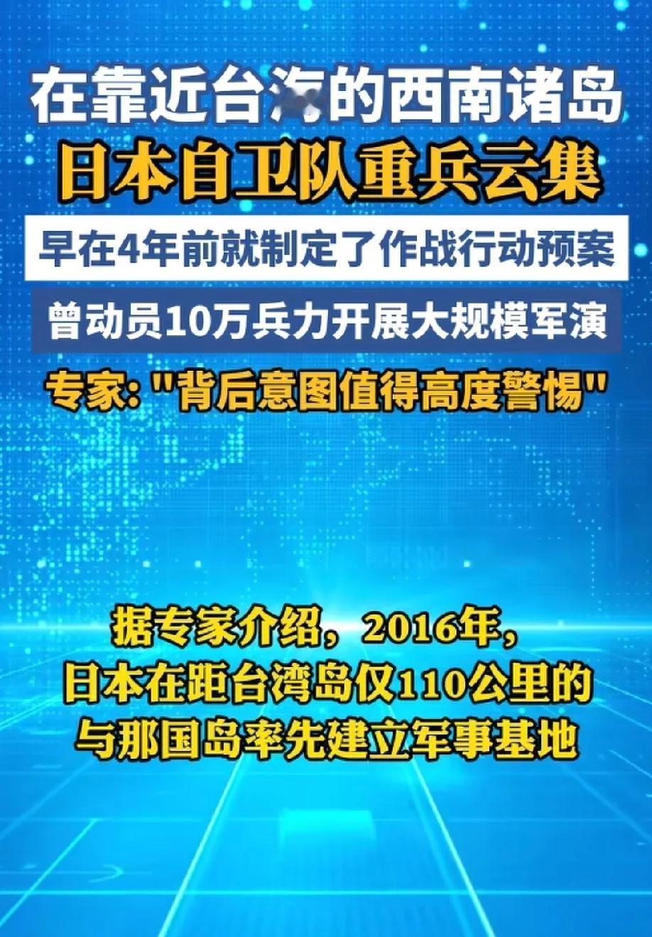 日本不是一时起意干涉台海,而是蓄谋已久! 在靠近台海的岛屿部署重兵,日本这一次是连装都不装了! 前期的敲打很显然没有打醒日本军国主义政客高市早苗,日本还在心存侥幸! 日本人心里有啥小九九? 无他,赌国运而已!没错,日本人最大的底牌并不是说军事实力经济实力有多强,而是他胆子足够大,敢一把梭哈! 甲午海战,他赌一把赢了! 日俄战争他赌一把,又赢了! 二战日本压上了所有,结果侵占了中国大片的领土,我们用了十四年才彻底将日本人赶出了中国,结果呢,日本人在美国的庇护下又重回世界第二,这也是他认为自己并没有输的根本原因,不仅没有输,从结果来看,战败国逆袭成全球第二,简直就是大赢特赢! 所以,这一次日本又在暗中准备赌国运了! 日本部署重兵想干啥昭然若揭! 首先要提防日本的偷袭,这货从来都是以偷袭者的身份登上历史舞台的,其次,能打就别留手,日本敢伸手就剁手,敢伸头就斩首! 这个国家从来都畏威不畏德,道德没有办法束缚对手,个人感觉,人道毁灭才是王道!