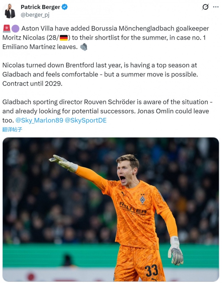 PatrickBerger透露,维拉对门兴28岁门将尼科拉斯感兴趣,将其纳入明夏引援名单,以防大马丁离队。