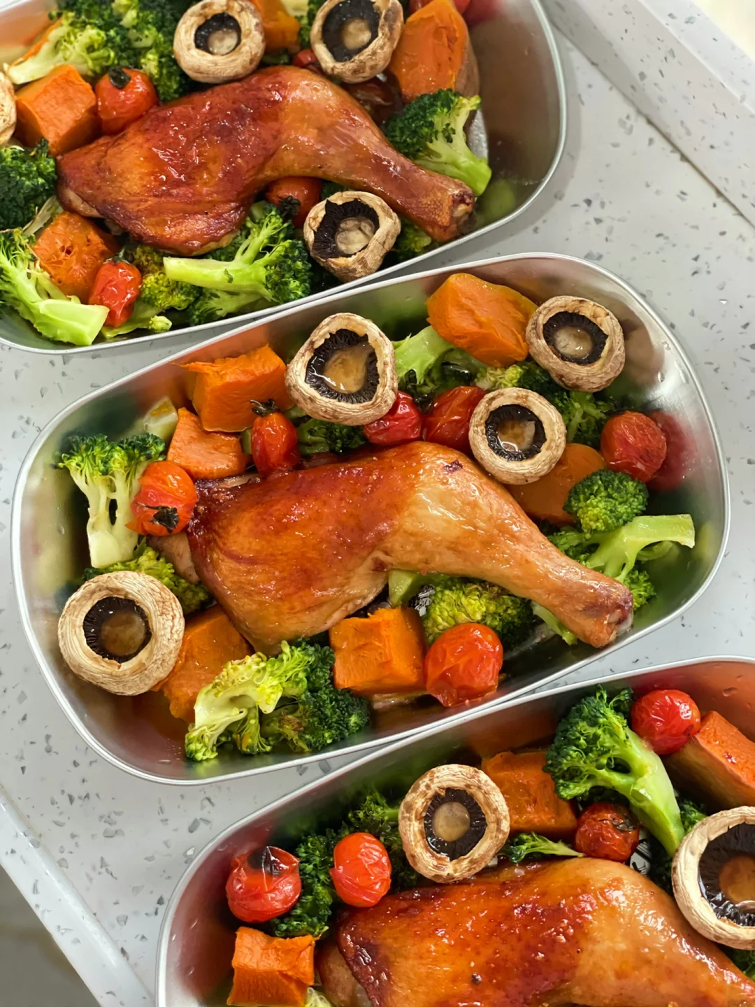 ❤️鸡腿烤出的汤汁已经有咸味了而且还会带一点鸡油,所以蔬菜不需要调料烤出来也会特别的香啦。如果家里的烤箱足够大,烤鸡腿后面的15分钟就可以和蔬菜同步一起烤啦