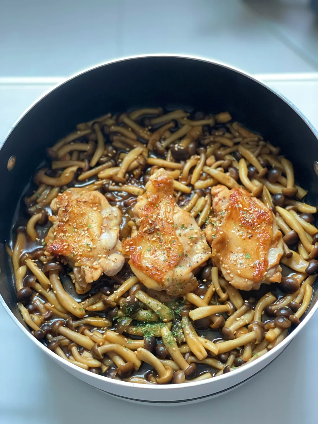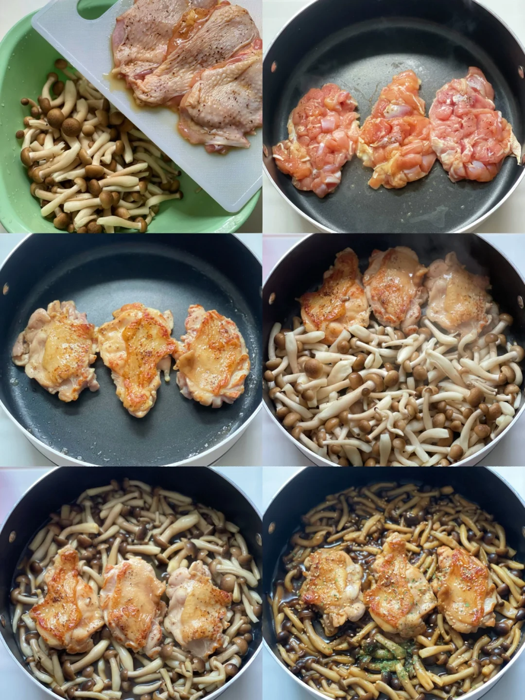 6️⃣蟹味菇、鸡排熟透后打开锅盖大火汤汁收浓稠即可