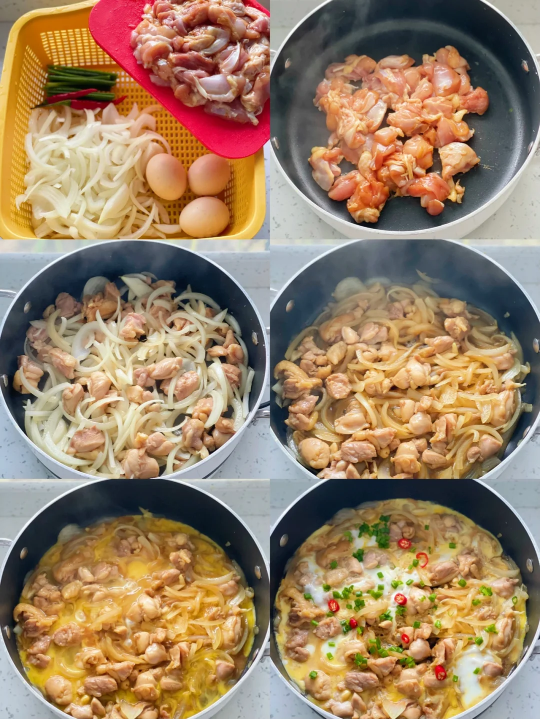 鸡腿肉|鸡蛋|白洋葱|葱|小米辣|盐|生抽|蚝油