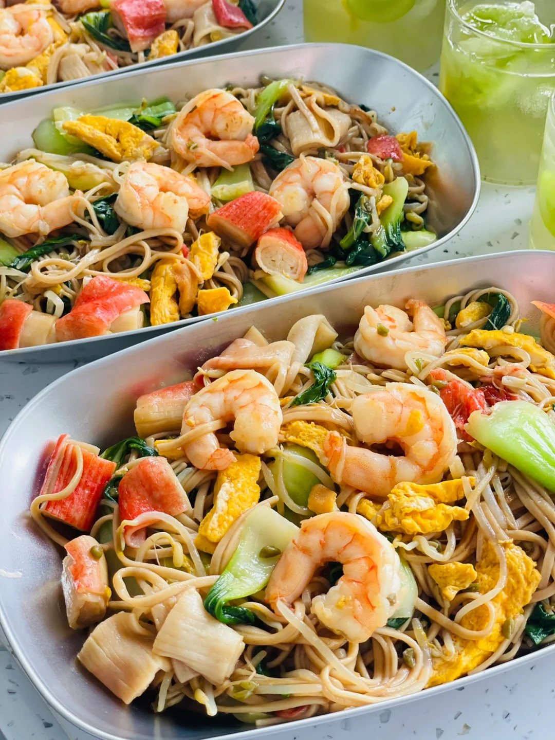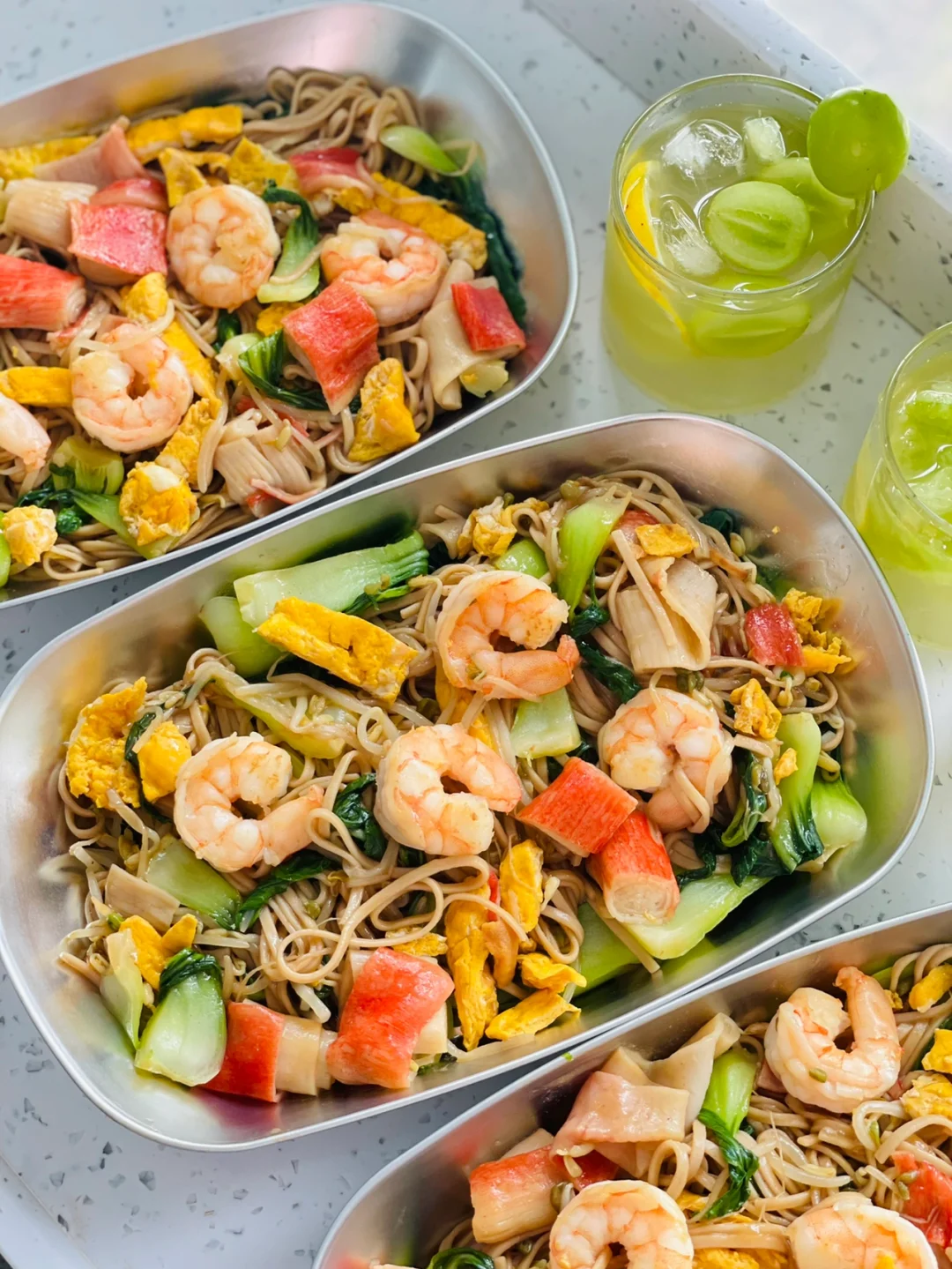 懒人食谱 笔记灵感 🌟海鲜蔬菜焖荞麦面 虾仁|蟹柳|鸡蛋|豆芽|上海青|荞麦面|蚝油|生抽 1️⃣荞麦面提前煮熟,放入冷水中备用 2️⃣虾仁,鸡蛋煎熟,鸡蛋煎熟后切成细块 4️⃣锅内放少量油炒豆芽,上海青,炒到7成熟 5️⃣下入面条,加蚝油,生抽调味 6️⃣下入虾仁,鸡蛋块,蟹柳,拌均匀再煮3分钟即可