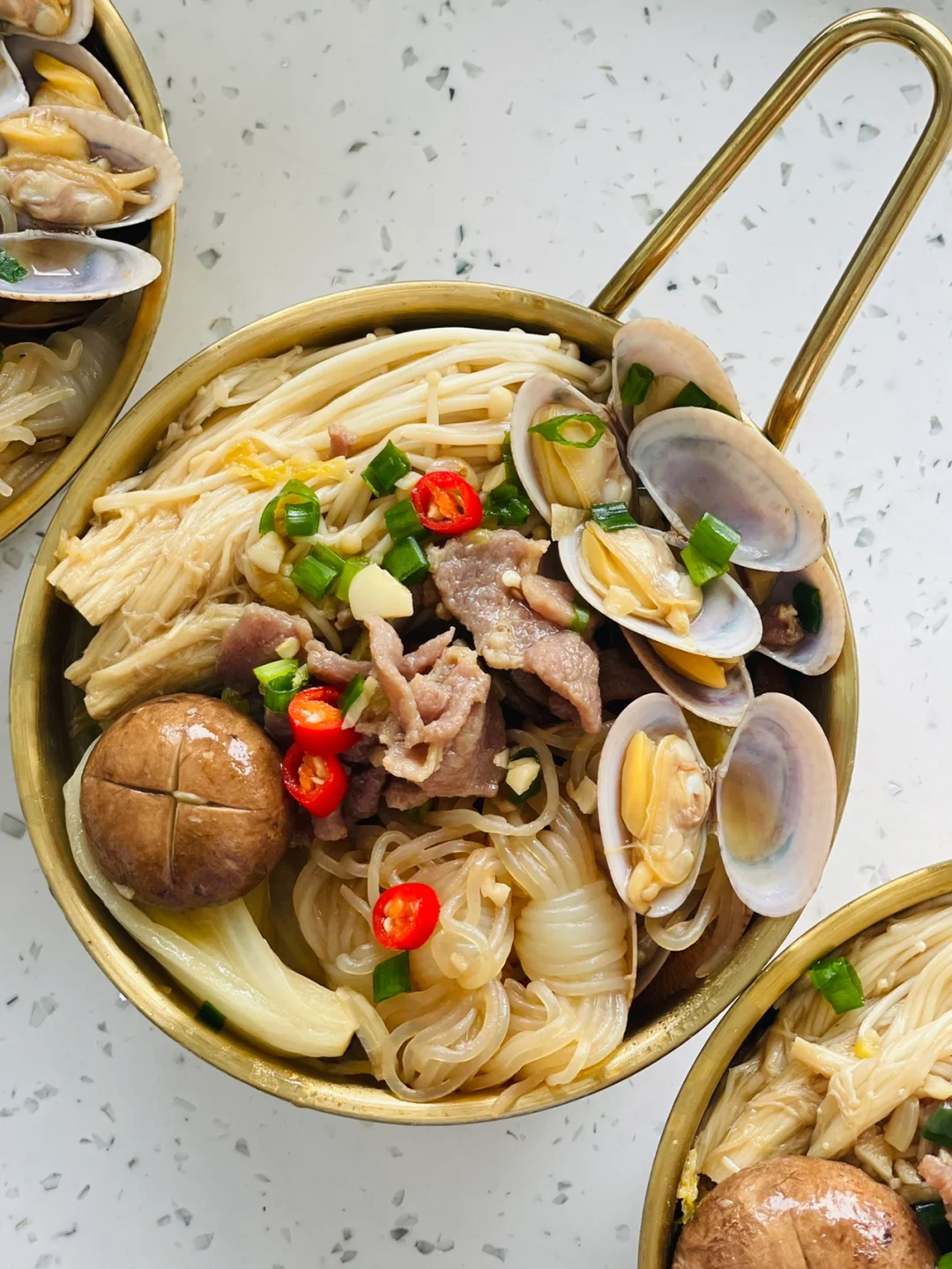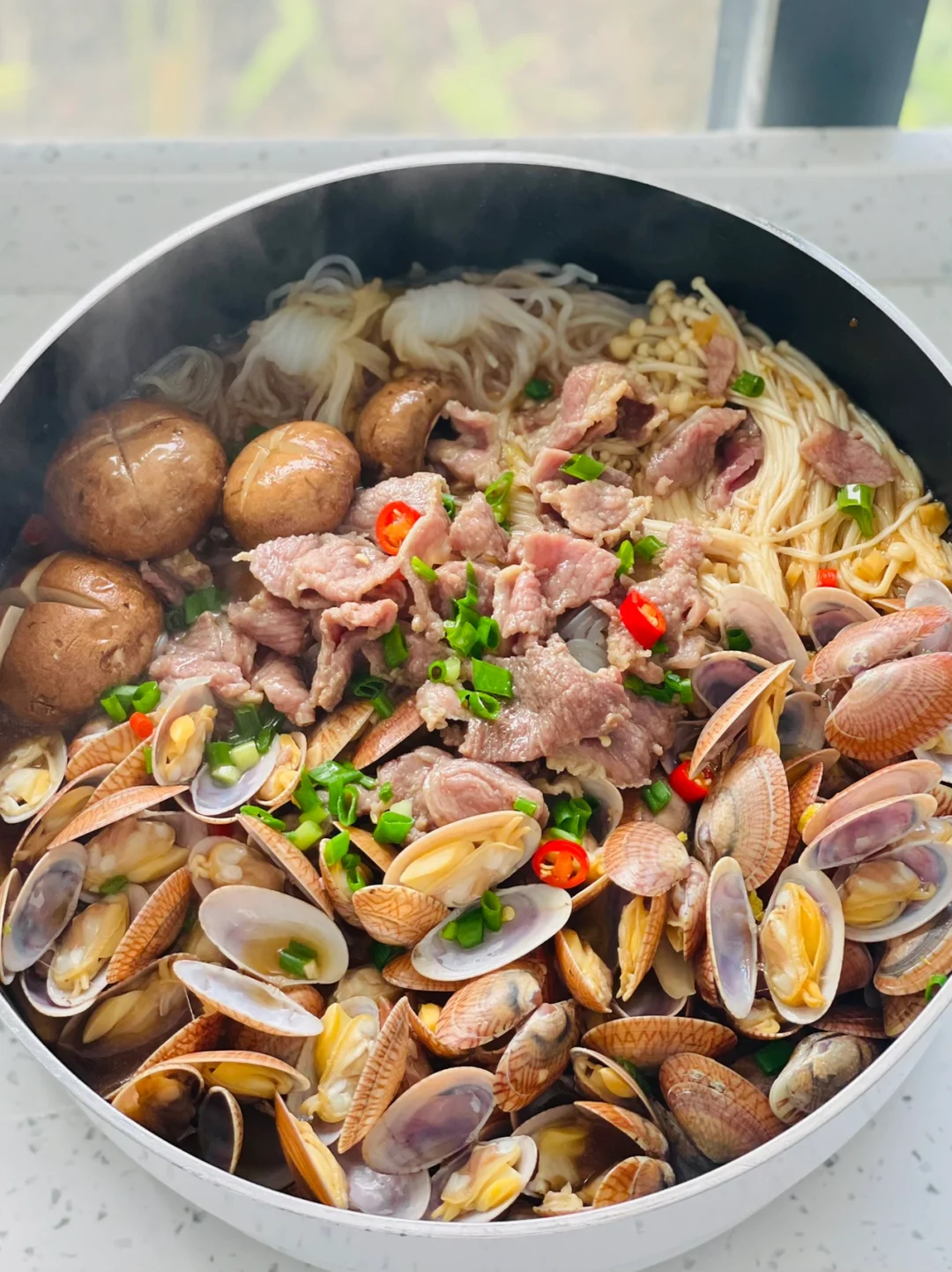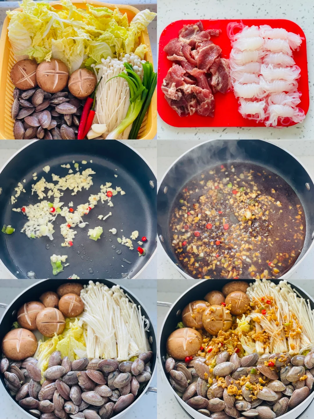 牛肉|花甲|金针菇|娃娃菜|香菇|魔芋结|小米辣|葱|蒜|蚝油|生抽