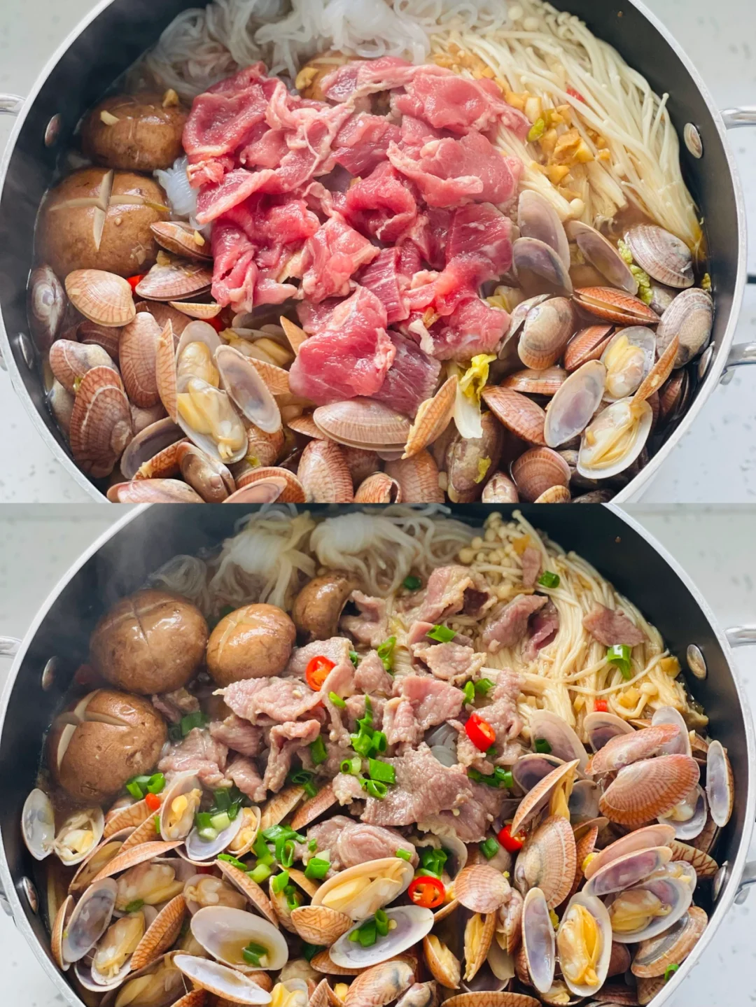 4️⃣魔芋结,牛肉片也下进去继续小火焖3到5分钟,保证花甲牛肉熟透,撒葱花开动