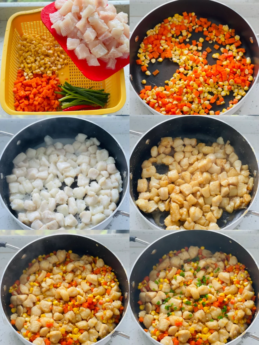 1️⃣龙利鱼切块表面裹少量玉米淀粉、白胡椒备用,胡萝卜切丁、玉米切粒