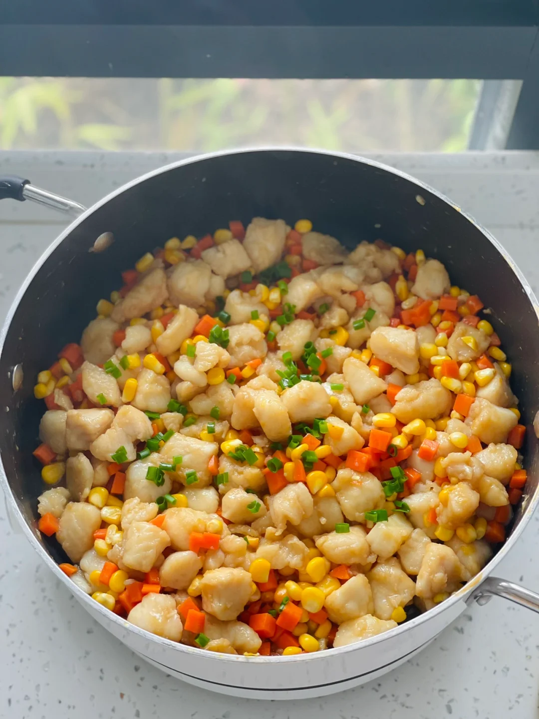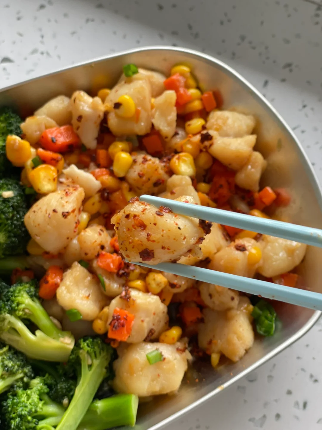 4️⃣蔬菜丁放入翻拌再焖煮5分钟撒葱花即可 ❤️吃的时候龙利鱼上撒了一把辣椒面,好吃😋