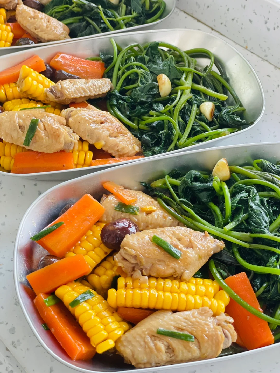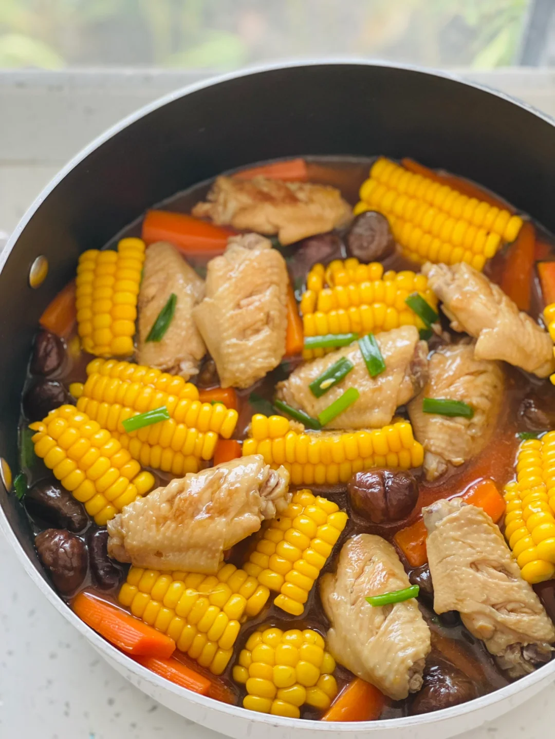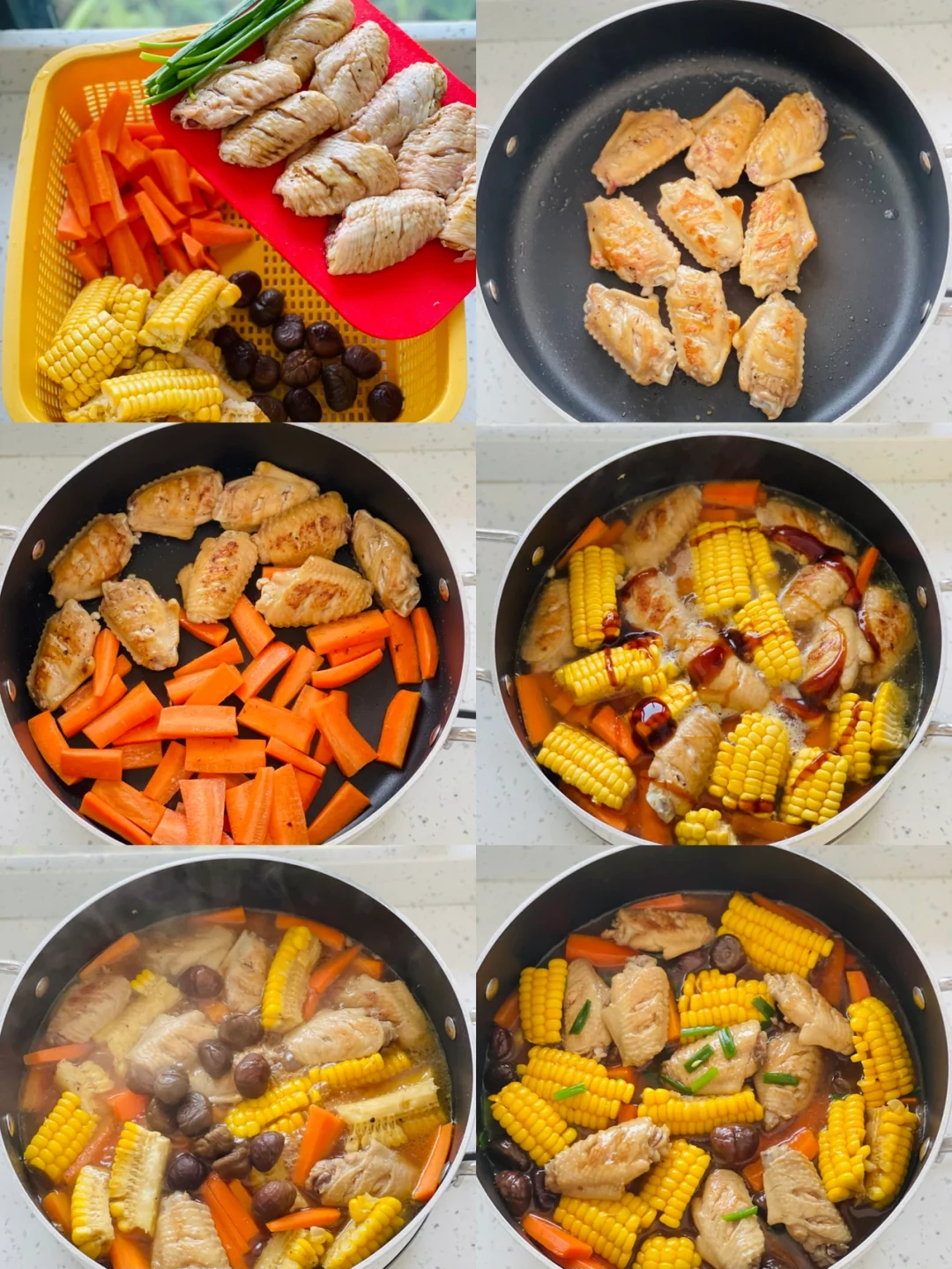 鸡翅|胡萝卜|玉米|板栗|蚝油|生抽|盐|葱|黑胡椒|玉米淀粉|葱