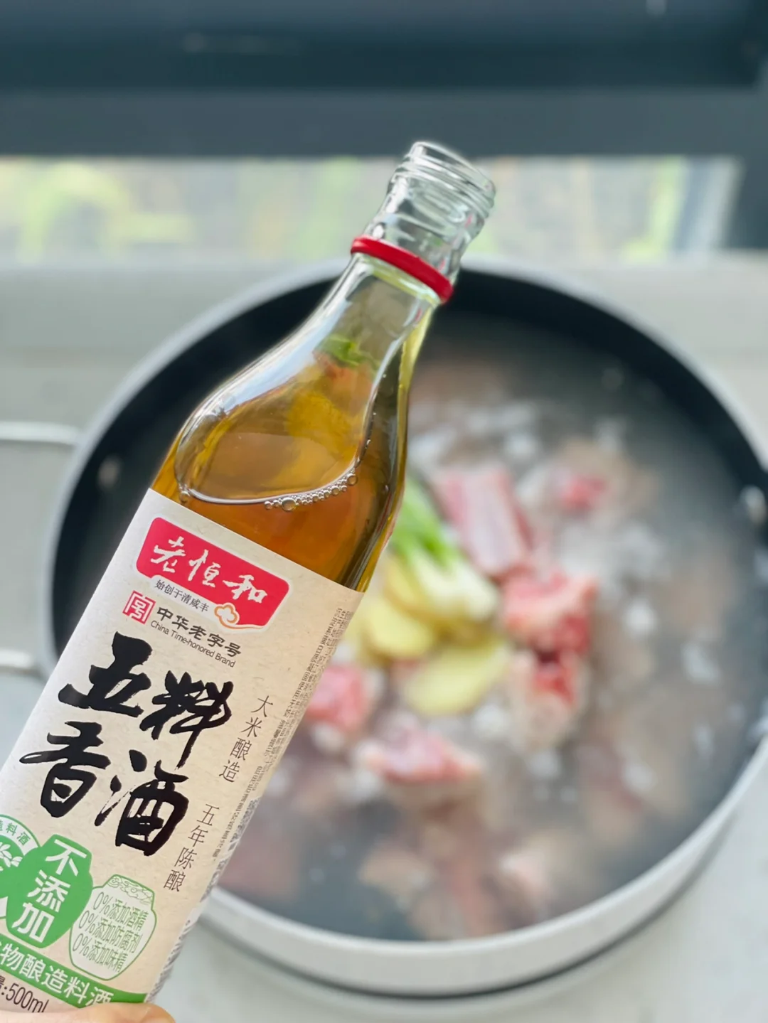 1️⃣排骨、葱白、姜、老恒和五香料酒,放入清水中煮沸,捞出浮沫