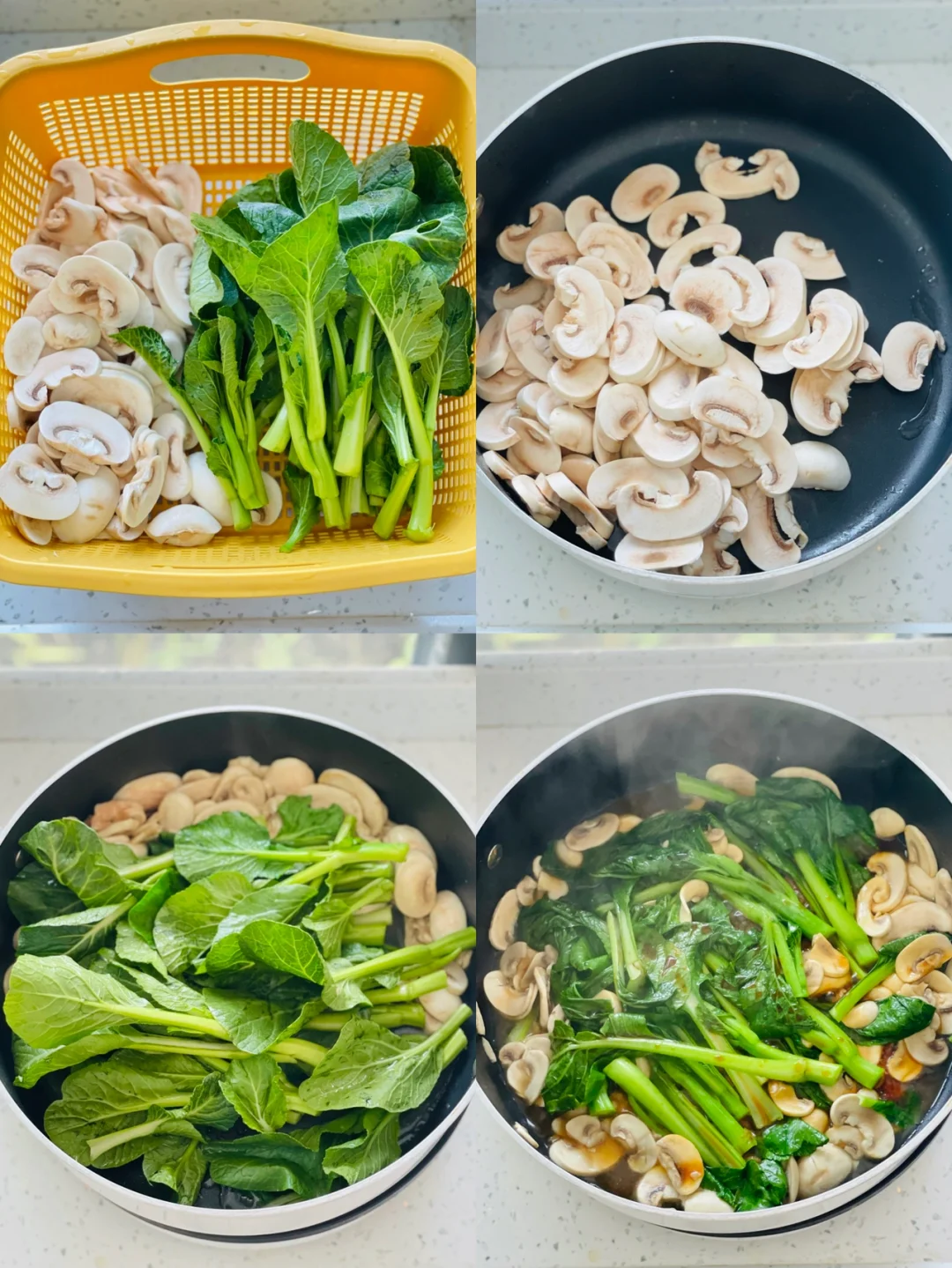 2️⃣锅内放少量油下口蘑,口蘑的水份炒出