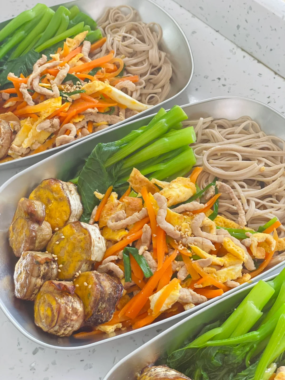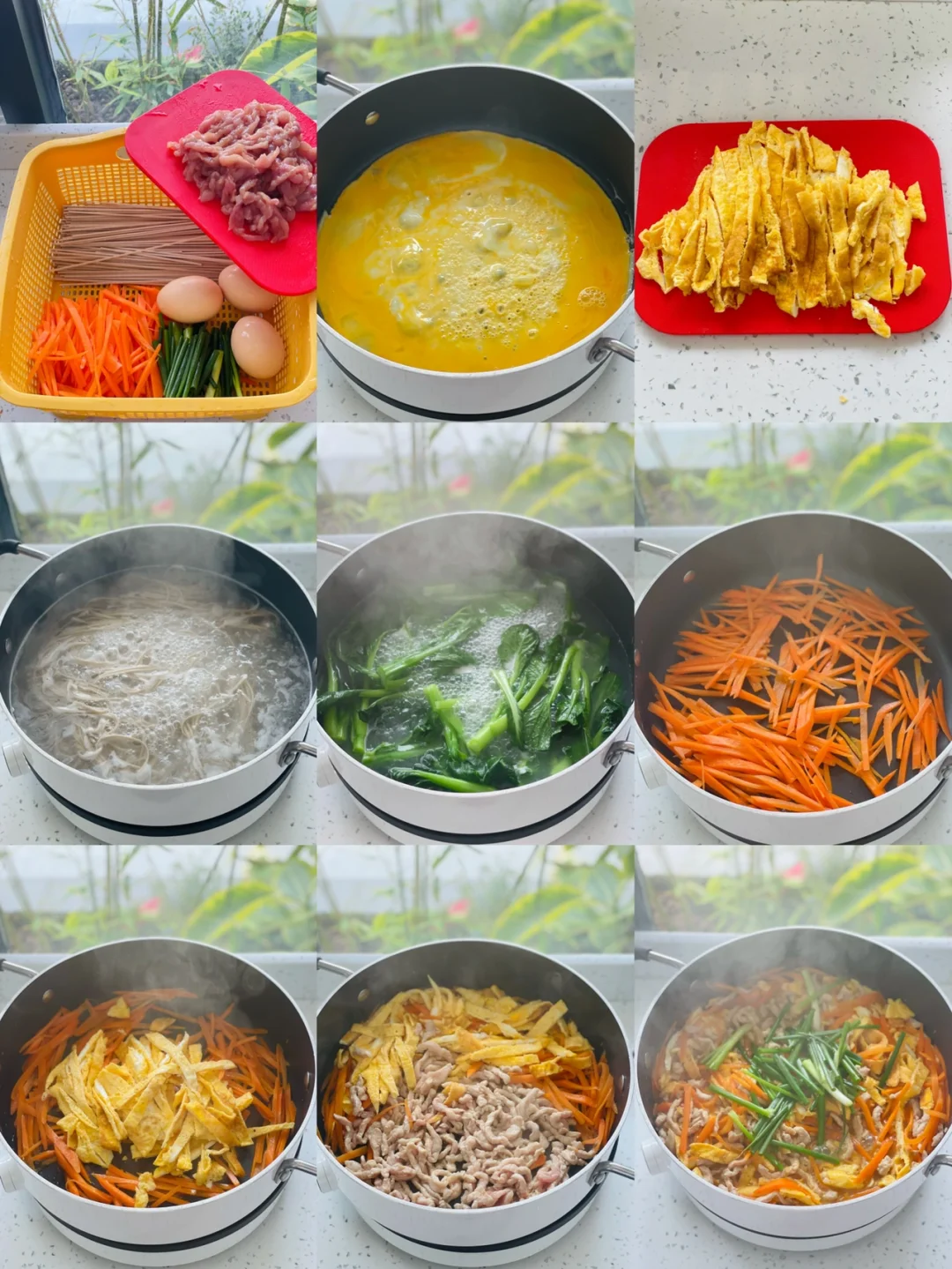 荞麦面用清水烫熟冷却备用。鸡蛋煎成蛋饼切丝,胡萝卜切丝,猪肉切丝提前用淀粉蚝油酱油腌制。把胡萝卜,猪肉,鸡蛋丝混合炒熟放葱提香。浇在荞麦面上。