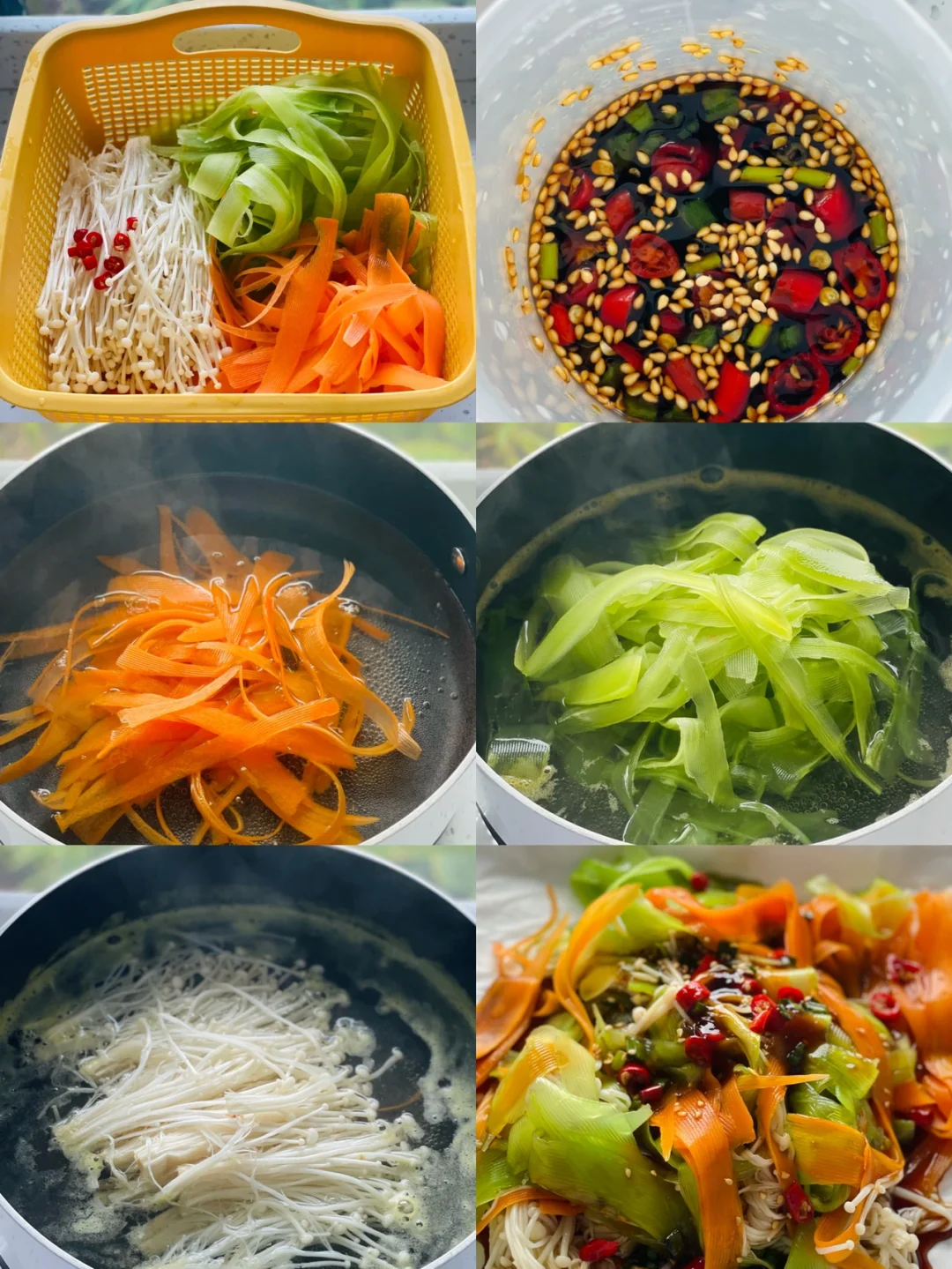 2️⃣沸水把莴笋,胡萝卜,金针菇分别烫熟