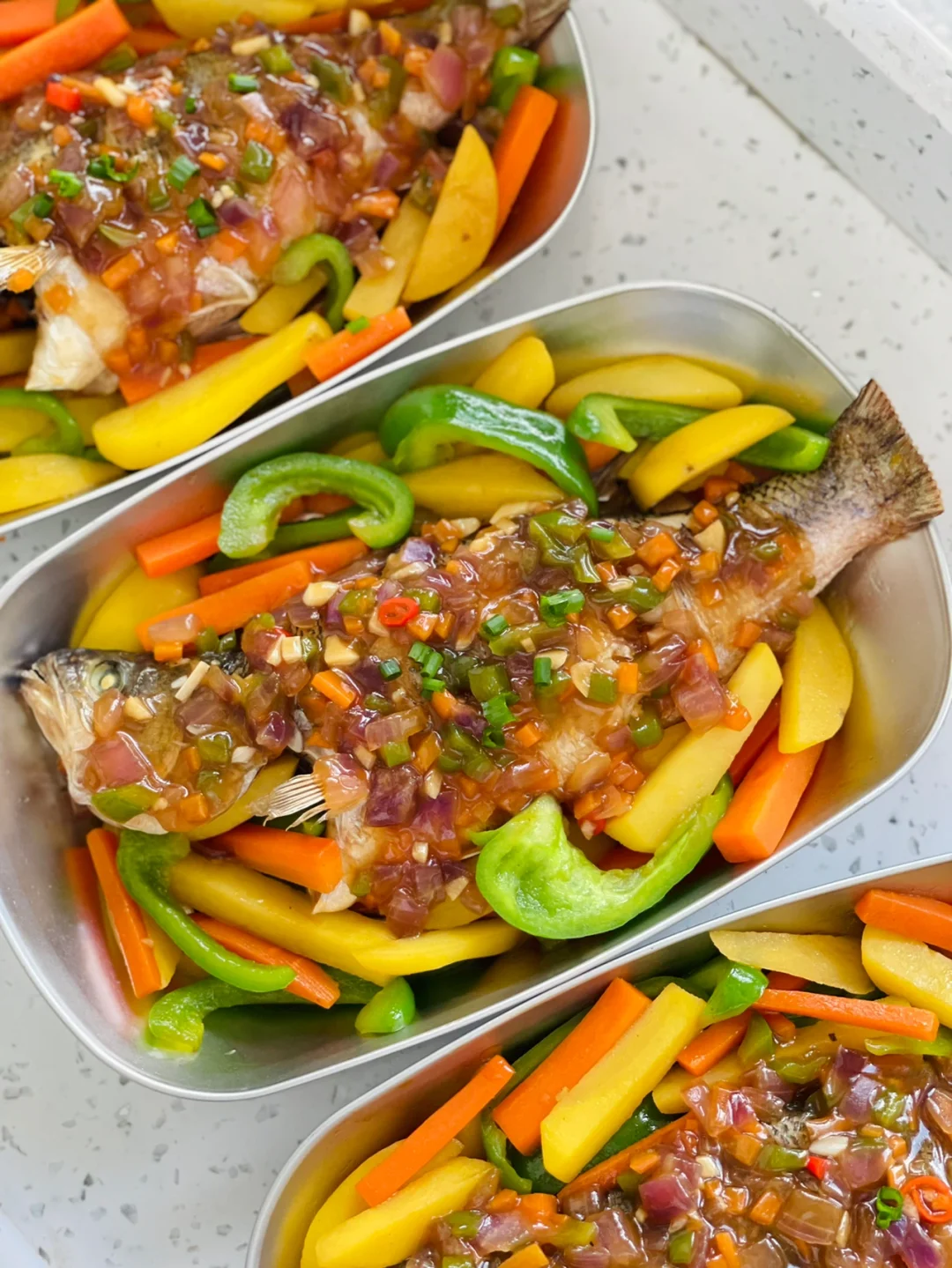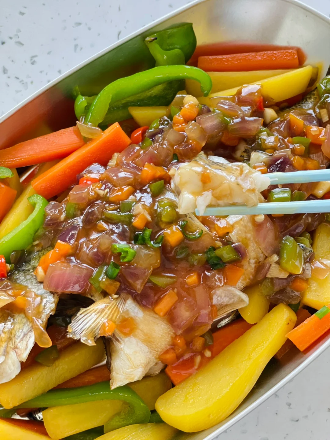 鲈鱼|青椒|胡萝卜|洋葱|蒜|姜|小米辣|蚝油|生抽|玉米淀粉|盐