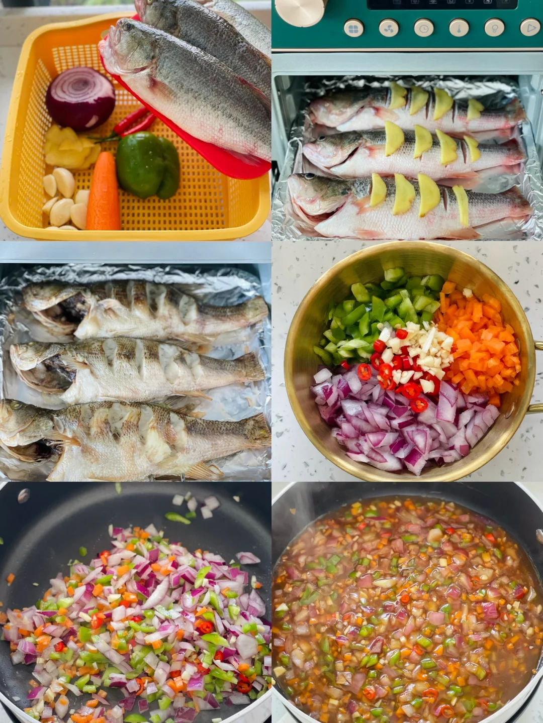 2️⃣鲈鱼表面刷一点油,放入烤箱180度烤18到22分钟。这一步也可以是用不粘锅把鱼煎到两面焦黄