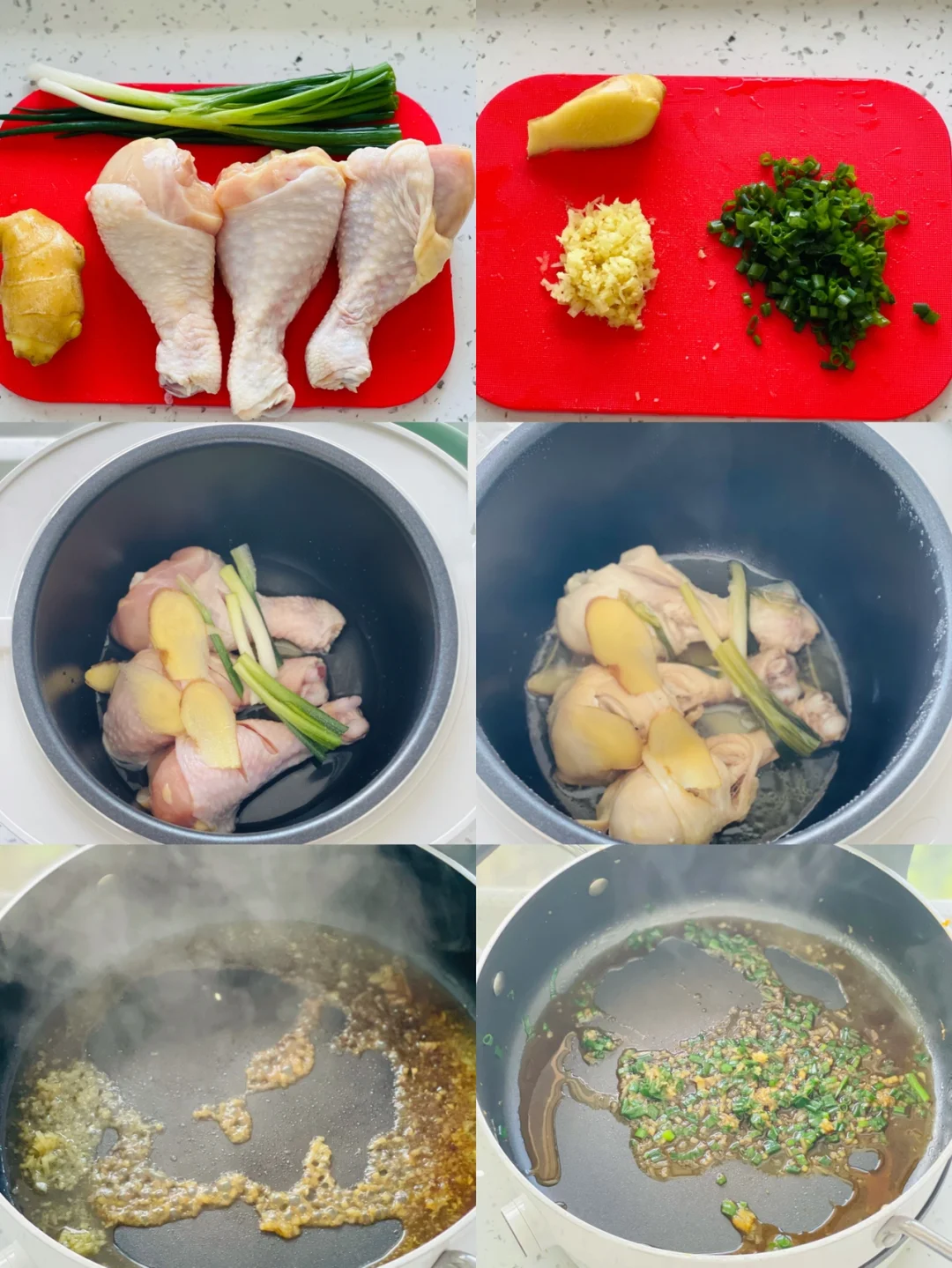 ❤️鸡腿放入电饭煲前可以划几刀,更容易煮熟。鸡腿煮熟后也可以冷却手撕再浇姜葱汁一起分享。