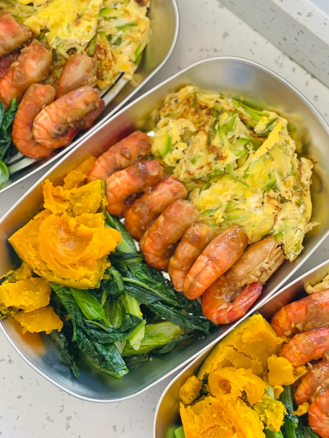 西葫芦煎鸡蛋 罗氏虾 油麦菜 贝贝南瓜