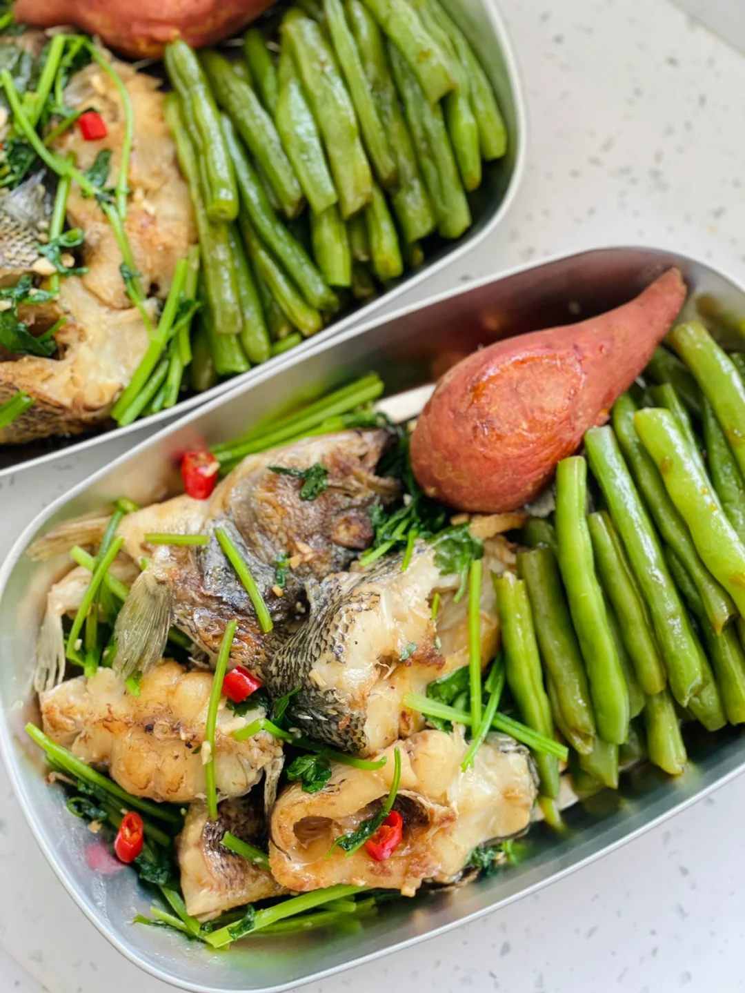 红烧鲈鱼 凉拌四季豆(四季豆一定要煮熟煮透哦) 碳水:红薯 红烧鲈鱼 翡翠四季豆 小红薯给流量 ,