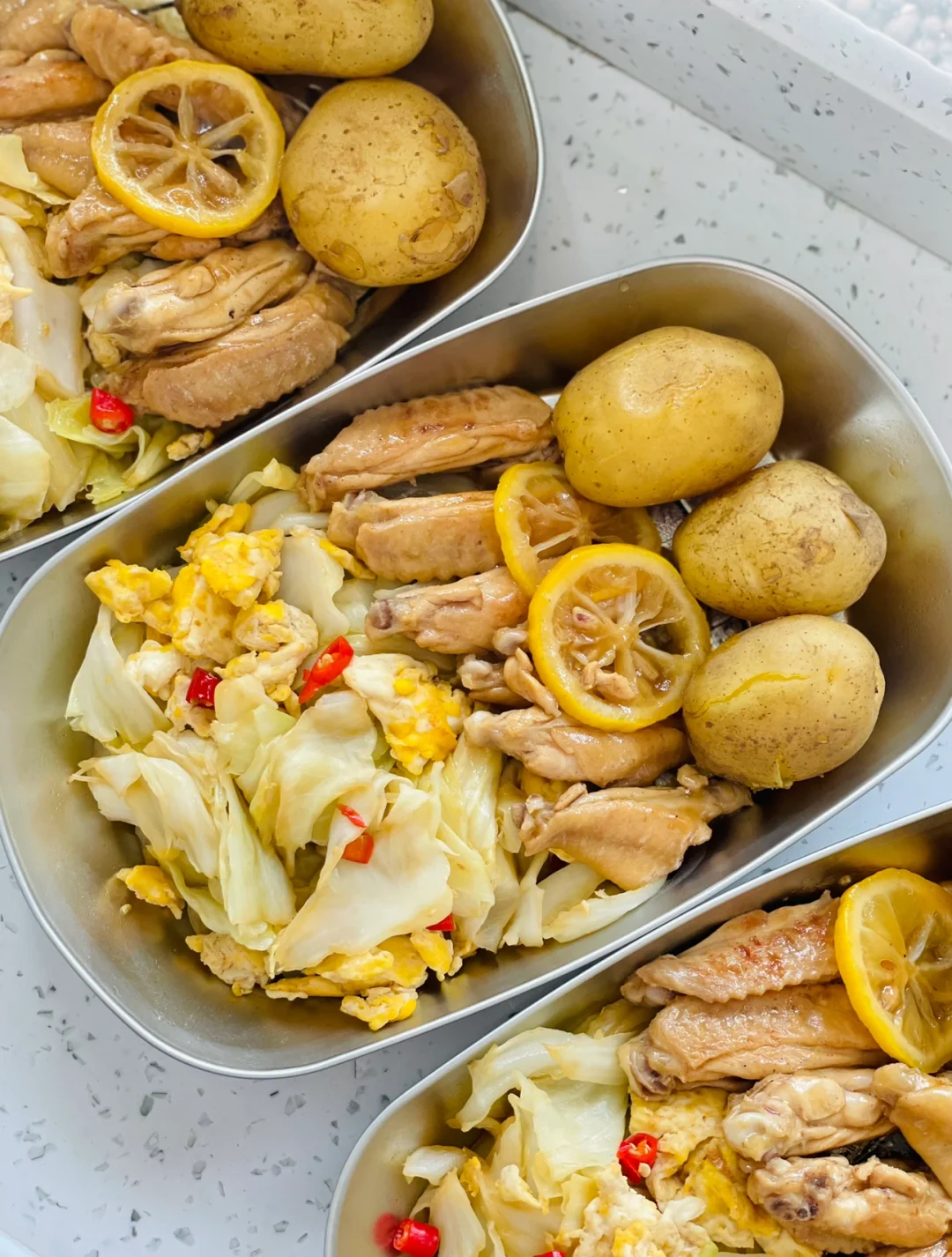 笔记灵感 包菜炒鸡蛋 包菜|鸡蛋|小米辣|蒜|酱油|蚝油|盐 包菜手撕成小块,鸡蛋打散。 锅内放油把鸡蛋炒熟捞出备用,锅里放油下蒜炒香放包菜炒至变软,把炒好的鸡蛋和包菜加一起,加酱油蚝油盐调味,撒一点小米辣增加风味。 柠檬鸡翅 鸡中翅|柠檬|五香粉|孜然粉|酱油|蚝油|淀粉 鸡翅对半切开不要切断骨头,放酱油蚝油五香粉孜然粉腌制(切开的鸡翅比较容易入味,不切也行) 不粘锅不用放油,把鸡翅煎到表面金黄,放少量的水和腌鸡翅剩余的料汁盖盖焖煮鸡翅熟透后放柠檬,调水淀粉勾芡。