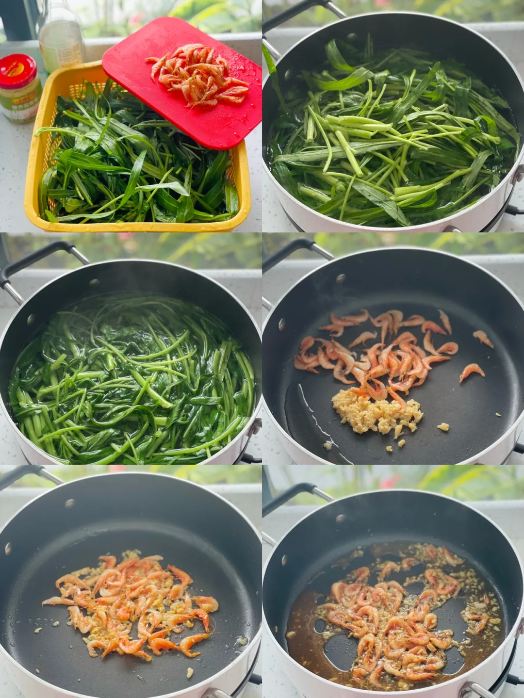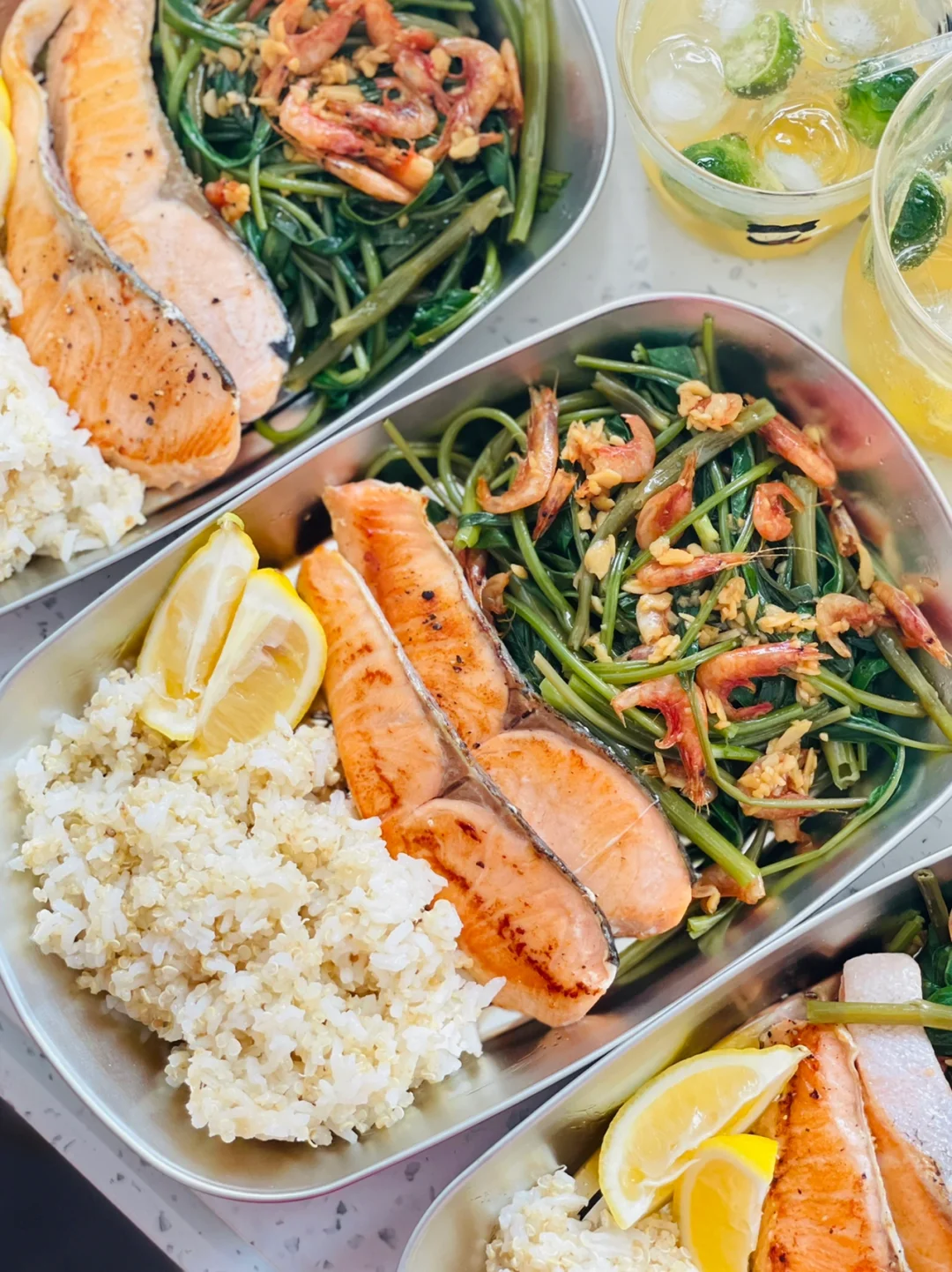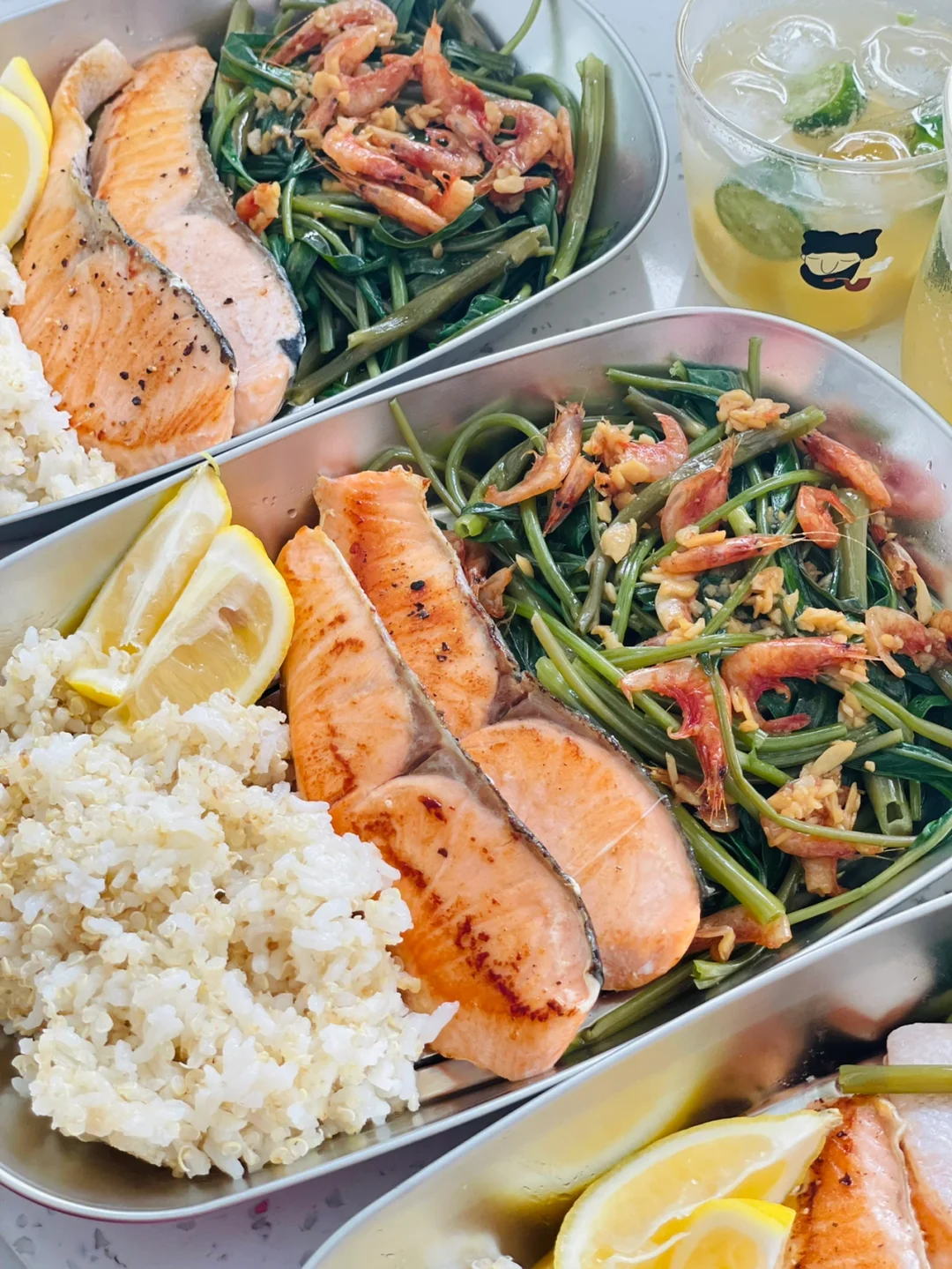 笔记灵感 煎三文鱼块 三文鱼|盐|黑胡椒|柠檬 锅内放少量油,三文鱼在不粘锅内煎到两面金黄,放黑胡椒盐调味,吃的时候挤柠檬汁。 蒜香小虾米拌空心菜 空心菜在沸腾的水中烫熟变色捞出,小虾米,油,蒜(我用的是瓶装的熟蒜)一起翻炒出香味,加酱油和少量的水煮开,浇在烫好的空心菜上面拌匀。 香芒青柠苏打水 芒果|青柠|冰块|苏打水 所有材料叠加放入就能喝啦! 今日碳水藜麦米饭