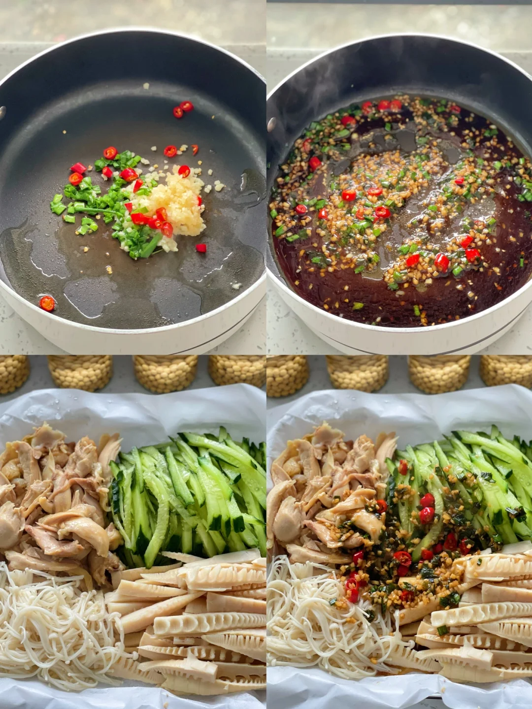 5️⃣锅内热油,蒜、葱、小米辣一起放入炒香,加入芝麻油、生抽、陈醋调味即可