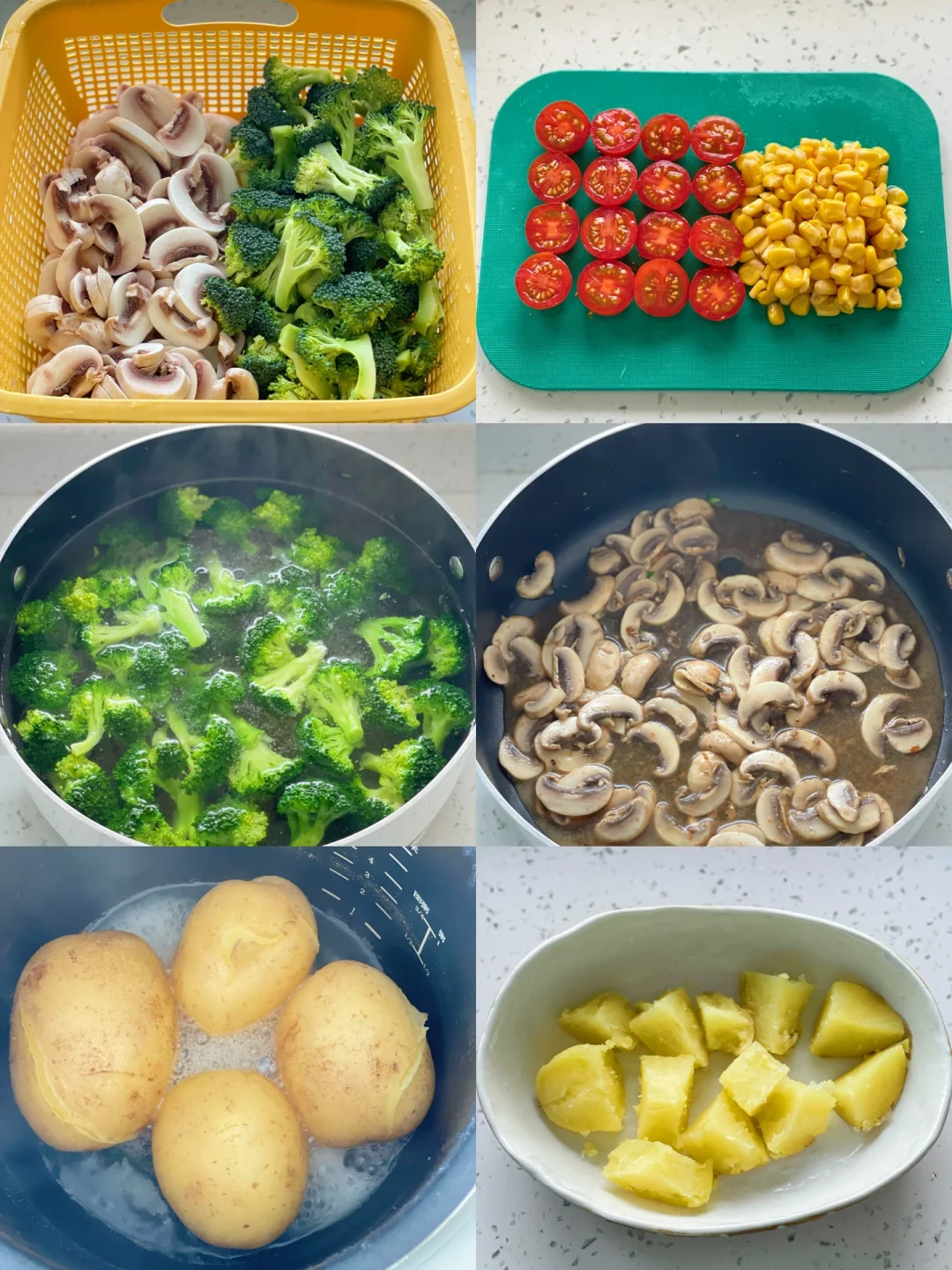 3️⃣西蓝花切小块,沸水中烫熟。土豆放入电饭锅中加水煮熟,去皮切小块。圣女果对半切开