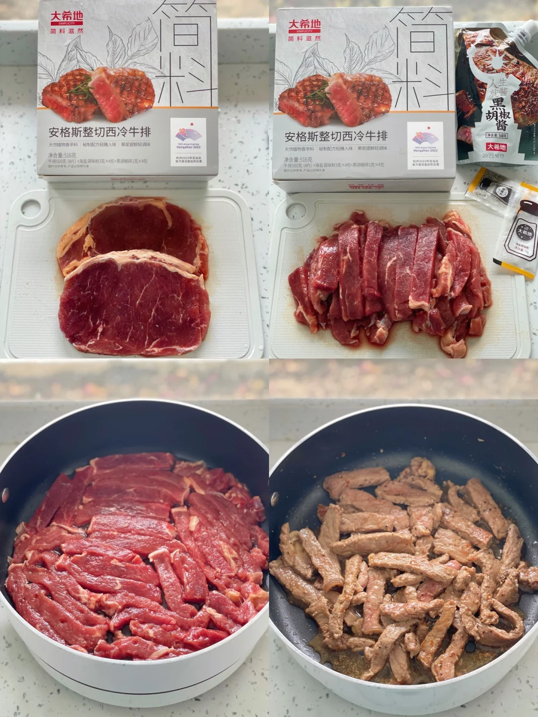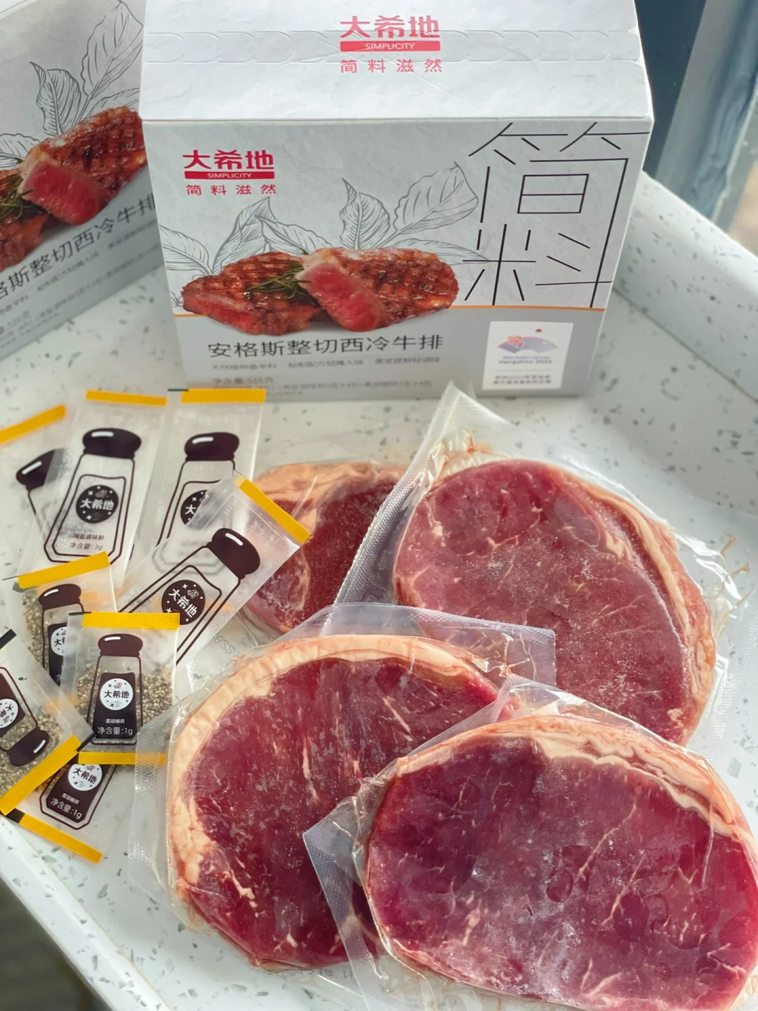 ❤牛排用的是大希地简料滋然西冷牛排,里面配有海盐、黑胡椒碎料包,烹煮相当的方便。