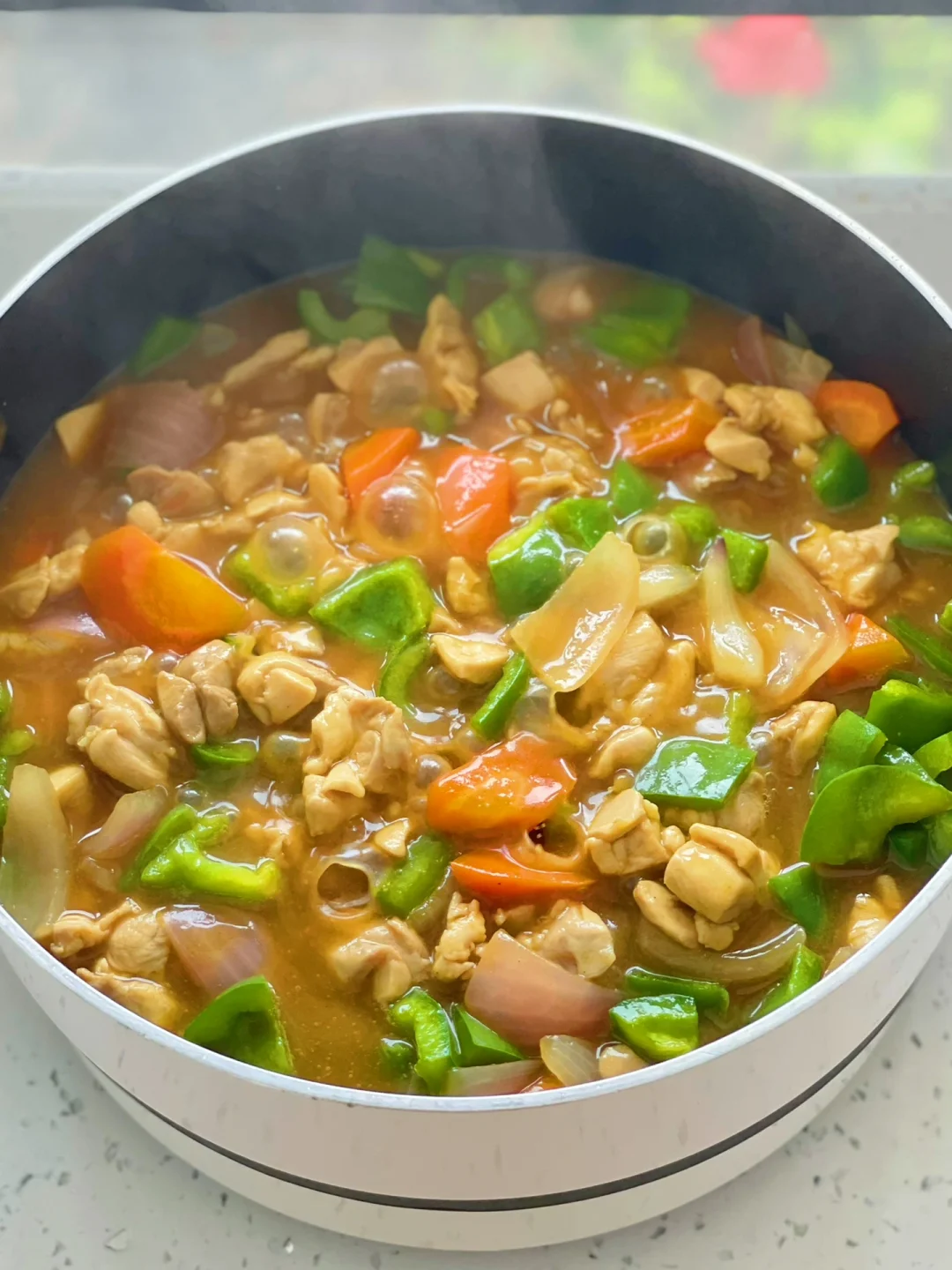8️⃣鸡肉青椒放入拌匀,打开锅盖中火煮3分钟即可