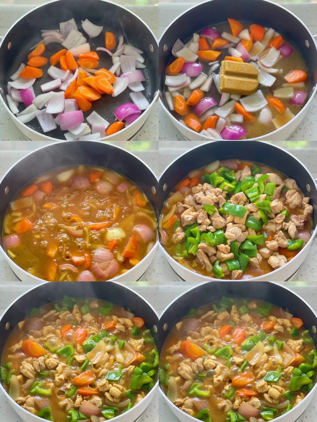 6️⃣加半碗清水,之前炒鸡肉多余的汤汁也可以下入,咖喱块也下入