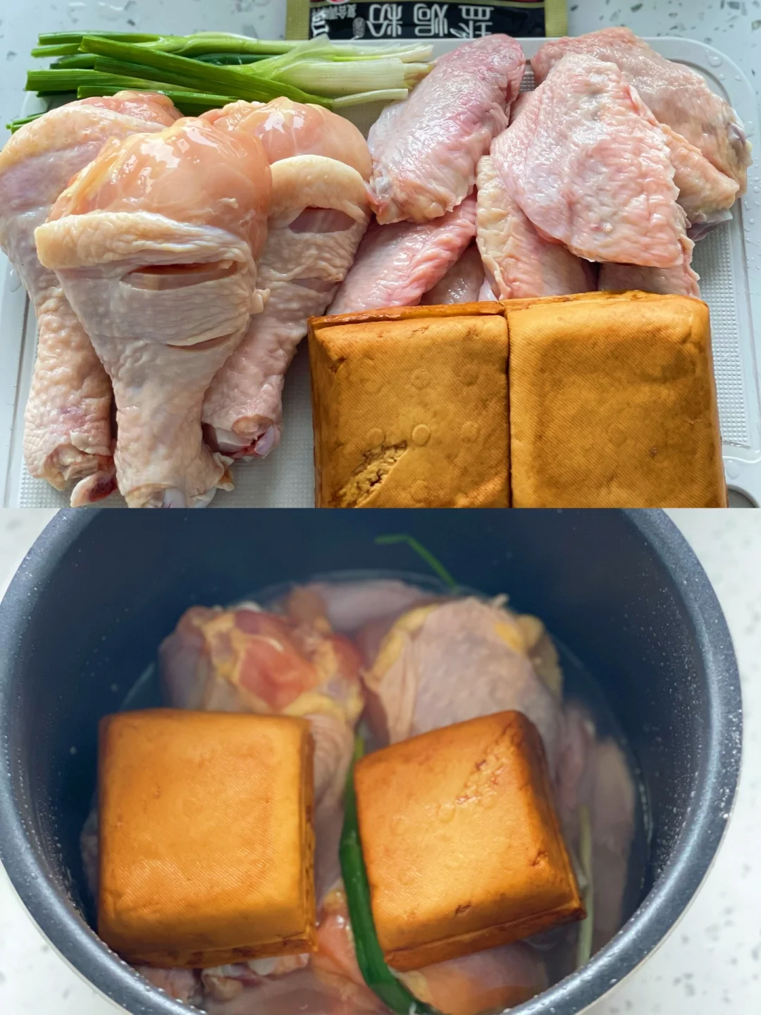 3️⃣电饭煲底部放葱段,鸡腿、鸡翅、豆干放入加水没过食材
