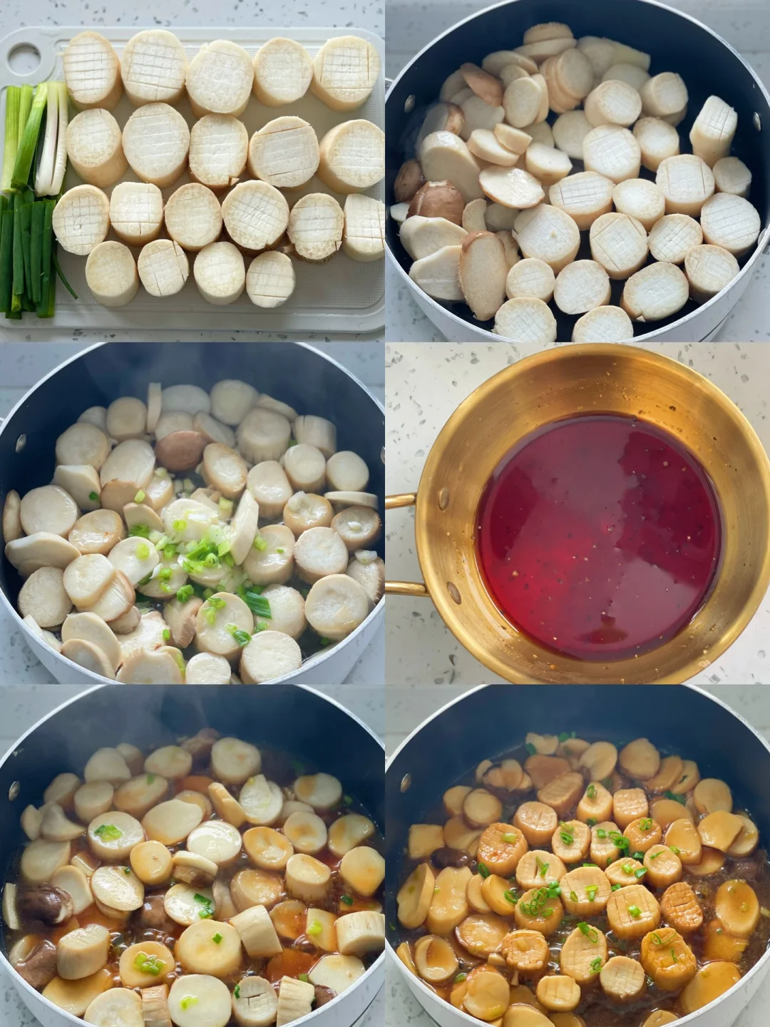2️⃣锅热油把杏鲍菇两面煎香,放入一些葱白提香