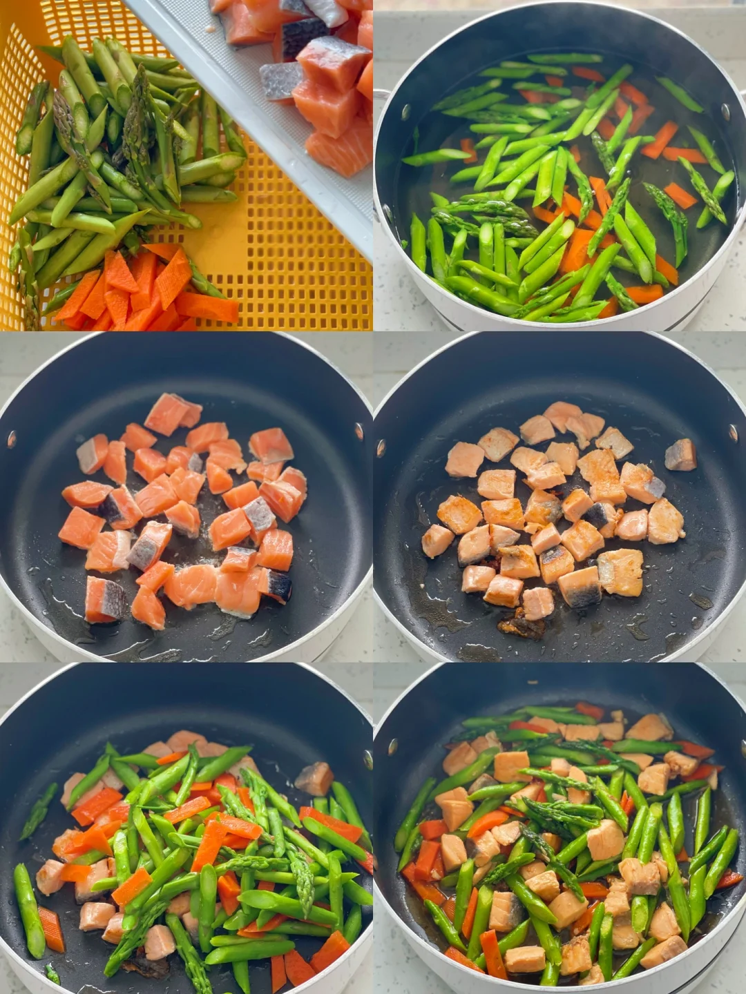 1️⃣三文鱼切小块,芦笋、胡萝卜切段