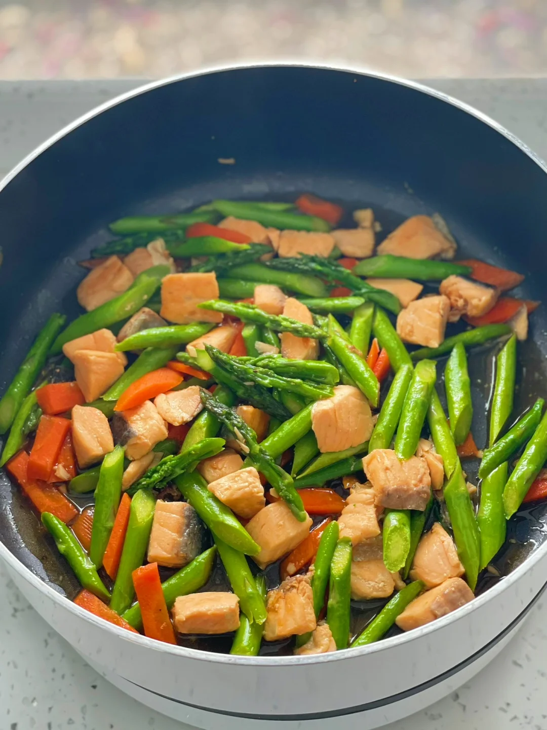 4️⃣烫熟的芦笋、胡萝卜加入,加一点的生抽炒匀✅
