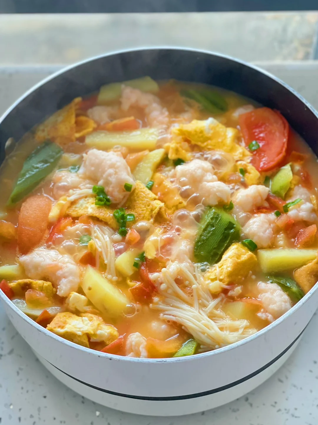 虾滑|鸡蛋|丝瓜|番茄|土豆|金针菇|浓汤宝|盐|葱花