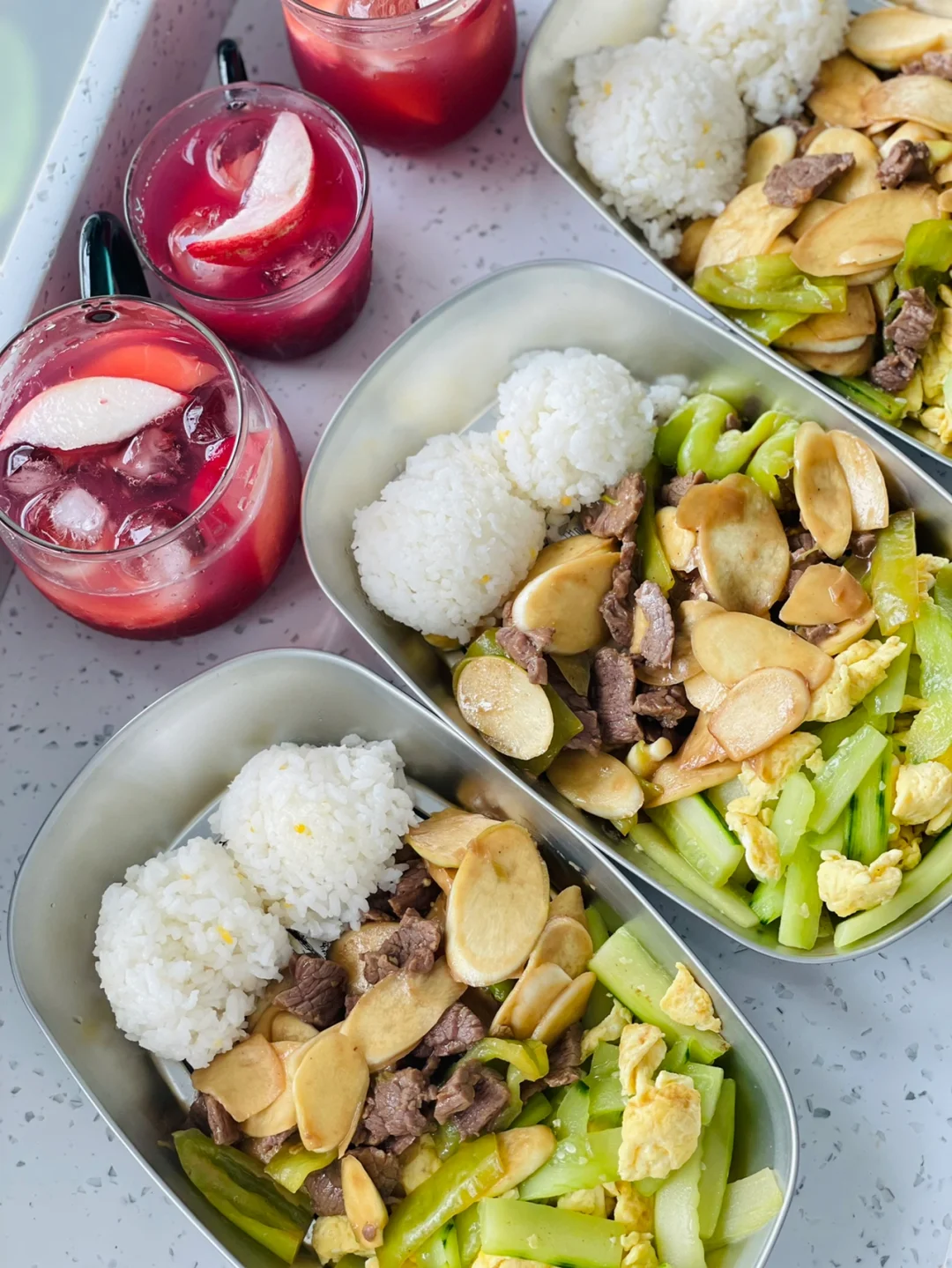 茭白牛肉 黄瓜鸡蛋 杨梅桃子柠檬茶