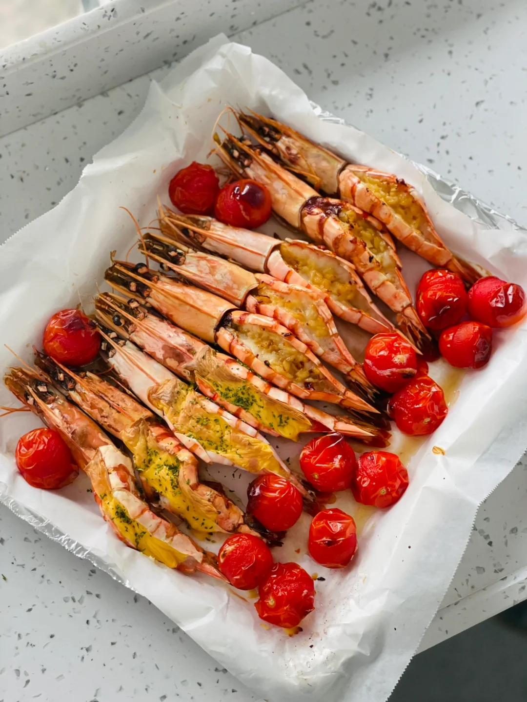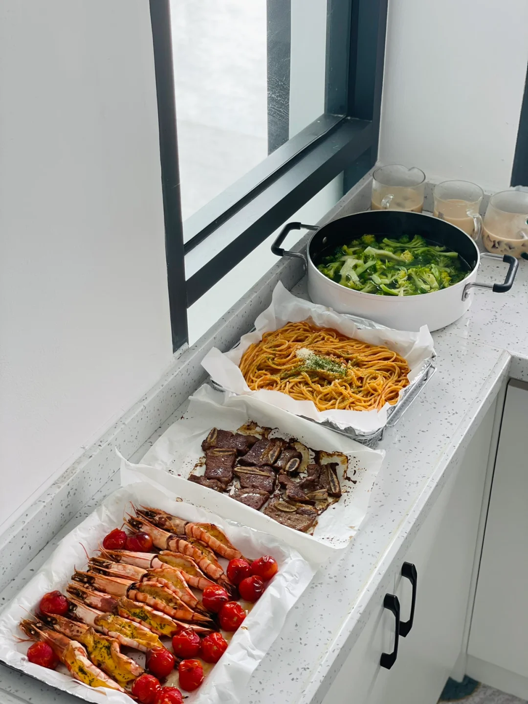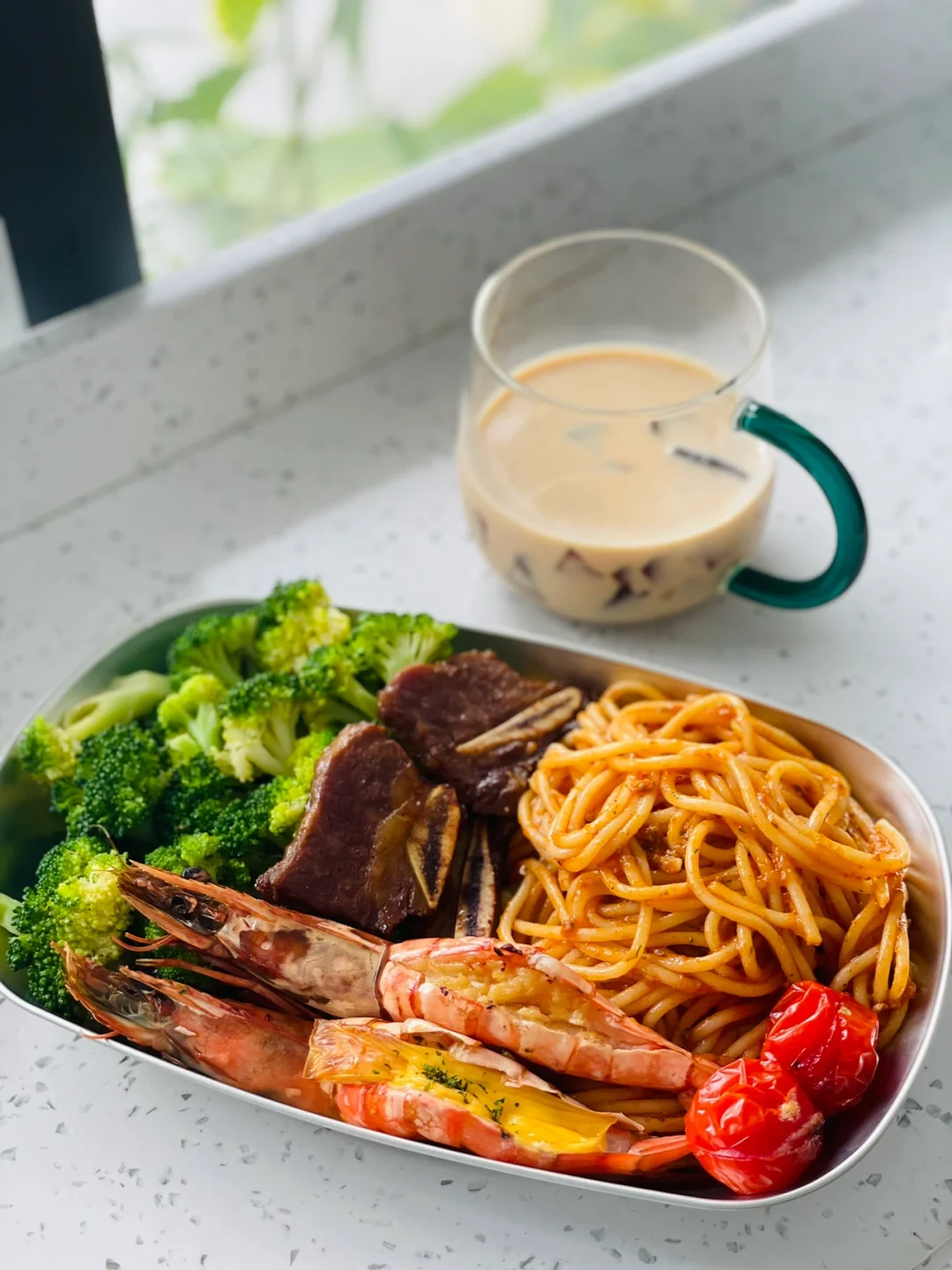 烤黑虎虾,芝士—蒜香🦐 黑椒牛仔骨🥩 肉酱意面🍝 西兰花🥦 冻冻奶茶🧋