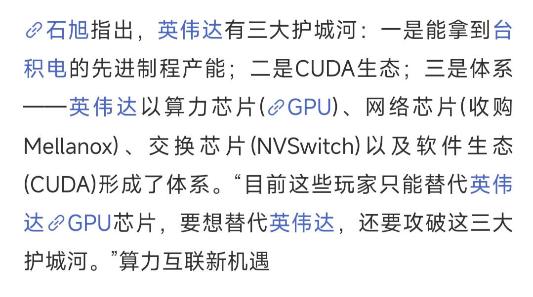 英伟达的三大护城河,一是掌握台积电的先进制程产能,二是CUDA生态,三是算力芯片,网络芯片,交换芯片和软件生态构成的体系。