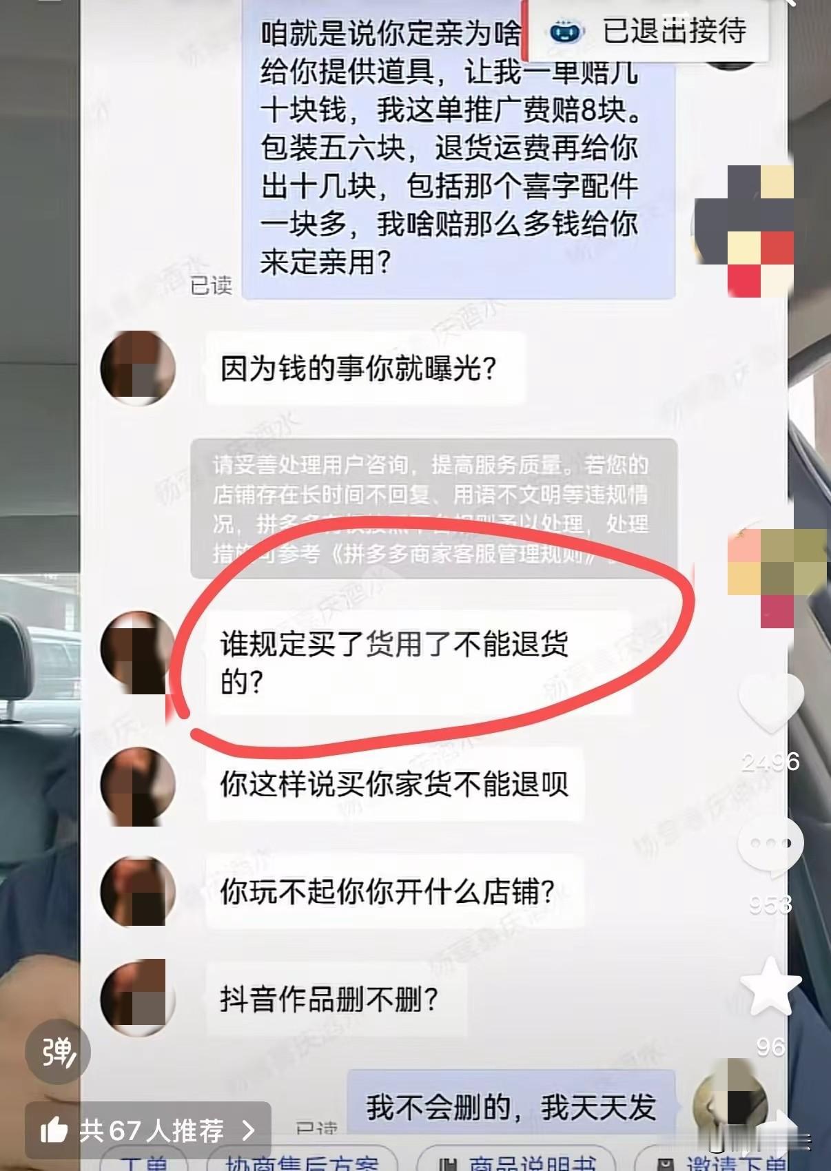 “白嫖高手?”山东潍坊一女子定亲买了5瓶果酒当摆台,礼盒包装丢了,喜字、红丝带也用了,用完申请退货退款,商家拒收之后,女子又让快递员重新派送,还申请平台介入,退款成功。商家气的把视频发网上要说法,不料,女子跑店铺里恶意下单,投诉商家,结果,商家先后被罚了600块钱,女子让商家删除视频,还说:谁规定买了货,用了,不能退货的? 近日,一男子在网上讲述了自己遭遇一女子用完5瓶果酒当摆台,又退货退款的事,让他觉得太憋屈和气愤,想说出来大家评评理。 原来,这名男子经营果酒,在网上销售,一位姓李的女子定亲,花了43块9买了5瓶果酒,当做摆台,拍照用的。 让男子没想到的是,李女士定完亲后,竟然申请退货退款。 李女士要把果酒给他退回来,这让他很是不解,好家伙,你定亲为了面子好看,把果酒当摆台,拍完照了,用完了,又要退货退款? 男子拒收了,本来他这果酒成本就低,对方用完了再退回,怕影响二次销售。 不曾想,李女士也是有办法,又给快递员打电话,让快递员在4天后,重新给商家派送。 男子收到李女士退回的酒后,一看包装非常头大,原包装是礼盒装,被李女士给丢了,退回来时什么没有。 而且,保护酒瓶的泡沫,红丝带、喜字配件李女士都绑到酒瓶上用了,这已经不能二次销售了。 而且,让男子更气的是,李女士退货还不想出退货的运费。 李女士也是会省钱的,申请退货退款时,说是果酒有质量问题,让商家出退货运费。 男子一看李女士将果酒弄成这样,自然不想给她退款。 可他哪里想到,李女士是有点机灵在身上的,她直接申请平台介入,直接退款成功。 男子这个气啊,这事自己有理说不清,他心里憋屈啊,就在网络平台发了视频。 结果,李女士看到了,她跑到男子店铺里威胁他,“你敢公开发我公开信息,你等着,我慢慢陪你玩……” 甚至,他还在男子店铺恶意下单。 李女士做了这些后,还不解气,又投诉了男子,结果,导致男子被罚了300块钱。 男子没想到,麻烦接踵而来,不知道是不是李女士的朋友,说了一些敏感的词,一直激怒男子,导致他又被罚了300块。 男子就因为李女士这个订单,先后被罚了600块钱。 男子在视频中说:“你不仅免费用了这个道具,而且还挣了几百块钱。” 这件事被男子发到网上,引起大家关注,而李女士也坐不住了,给男子发信息威胁男子删除视频。 男子在视频中说,对于李女士具体住在哪,门牌号他都不清楚。 通过男子和女子聊天截图中,可以看到,男子说:你定亲为啥我给你提供道具,让我一单赔几十块钱,这一单包装五六块,退货运费再给你出十几块,还有喜字配件一块,我凭啥赔那么多钱给你来定亲用。 而李女士回复说:因为钱的事你就曝光,谁规定买了货,用了,不能退款的? 这事引起大家讨论,43块9的果酒当摆台,真的有必要退货退款吗? 有人说,商家截得聊天图最离谱的一句是:“谁规定买了不能退”,包装拆了,喜字也用了,影响二次销售了,商家才不退,这女子还让商家被平台赔了600元,真是活不起了。 一开始还以为是43.9万,结果看了多次,发现是43.9元,不到50块钱,好掉价,几十块还退,缺这点钱吗? 我是干不出来这个事,拿到手不合适,半个小时内一定点退货退款,东西还得整整齐齐,原模原样装回去。 也有人说,我也做婚庆用品,东西使用过后退货的人多了去了,还不承担运费,申请质量问题让商量承担运费。为了几十块钱,什么吉利不吉利的,只要能白用,什么手段都会用上。见识到太多人性丑恶的一面。 天啊!怎么还有这样的人!简直了,天天心眼子都用来算计人了,真的难想象生活中和她们相处得多糟心。 订婚是喜事,有必要这样吗?就40几块钱,还退来退去,现在商家也不容易,你退就退吧!起码别丢了或者使用人家原包装、配件啊,都影响了人家二次出售了,这么做有点缺德了,真是什么人都有。 那么,李女士的行为是否适用“七天无理由退货”? 《消费者权益保护法》第24条规定:经营者提供的商品或者服务不符合质量要求的,消费者可以依照国家规定、当事人约定退货,或者要求经营者履行更换、修理等义务。 李女士退货需满足“商品完好”条件。 此事中,李女士将礼盒包装、泡沫、红丝带等配件丢弃,且酒瓶上的喜字等装饰已被使用,商品已无法恢复“原有品质、功能”,不符合“完好”标准,商家有权拒绝无理由退货。 如果,平台介入后直接退款。 商家可向平台申诉,提供商品拆封、使用过的证据,例如照片、视频,要求撤销退款。 最后,买卖双方都需要相互尊重,相互理解,做人要诚信,不能只顾自己的利益而不管他人损失,这样做人做事久了失去人心,没好人缘了。 关注@福康说法 从日常点滴学法律,生活安稳更有底