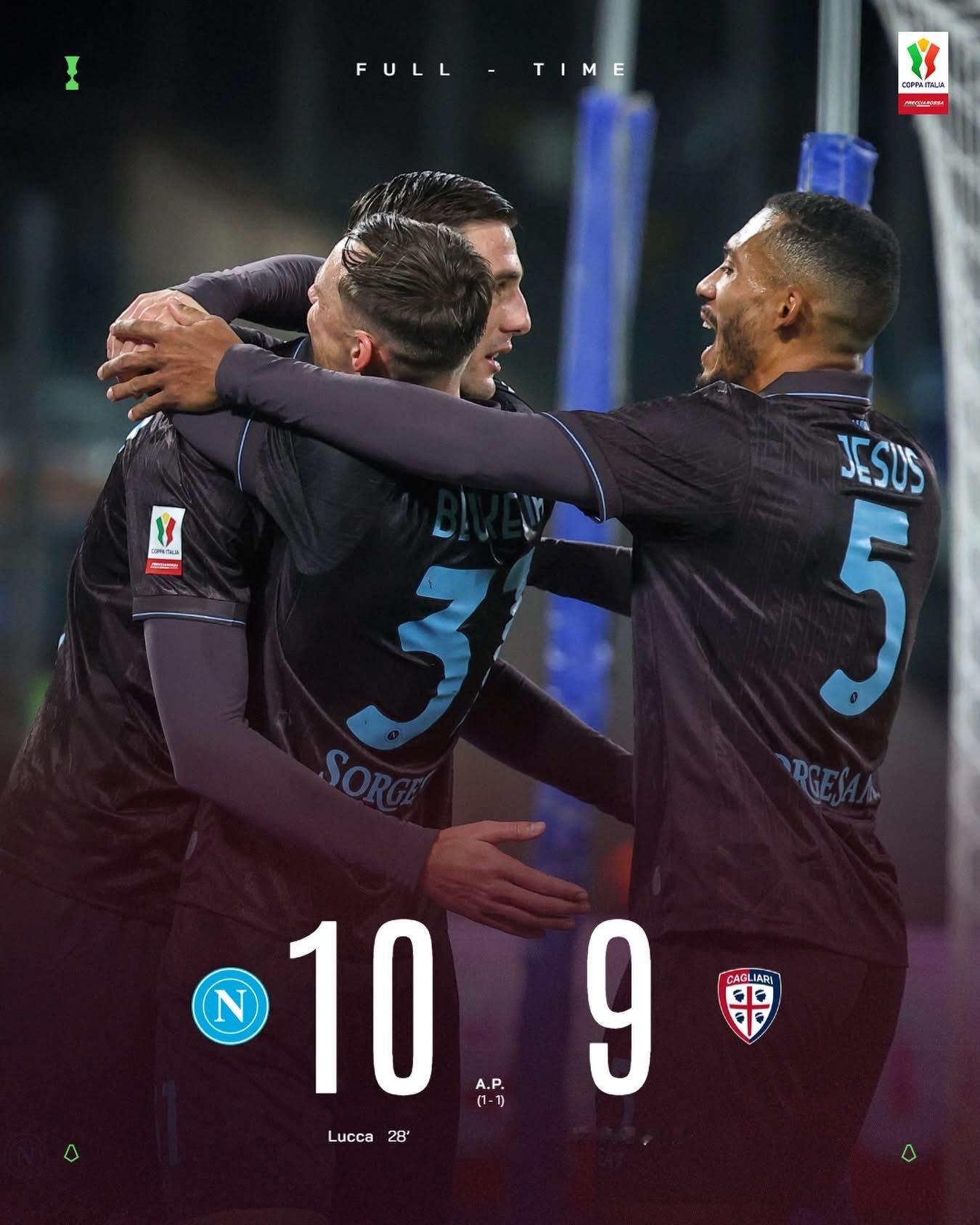 意大利盃第三圈賽事今日凌晨結束咗五場角逐,以後備應戰嘅拿坡里同卡利亞里大戰至十二碼決勝先贏9-8(總比數贏10-9)晉級。相反,祖雲達斯、國際米蘭以及亞特蘭大都以較輕鬆嘅姿態擊敗對手獲得8強席位,其中亞特蘭大同國際米蘭更加大勝對手四粒。今晚將會繼續有博洛尼亞🆚帕爾瑪,以及拉素🆚AC米蘭嘅賽事送上,至於羅馬🆚拖連奴同費倫天拿🆚科莫嘅賽事就因故順延到一月份進行。 🇮🇹🏆