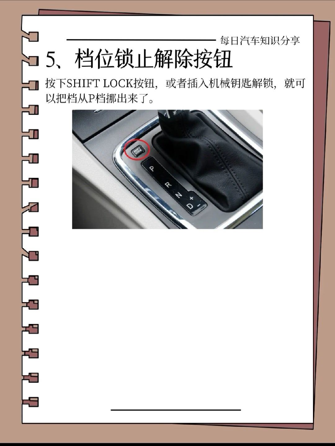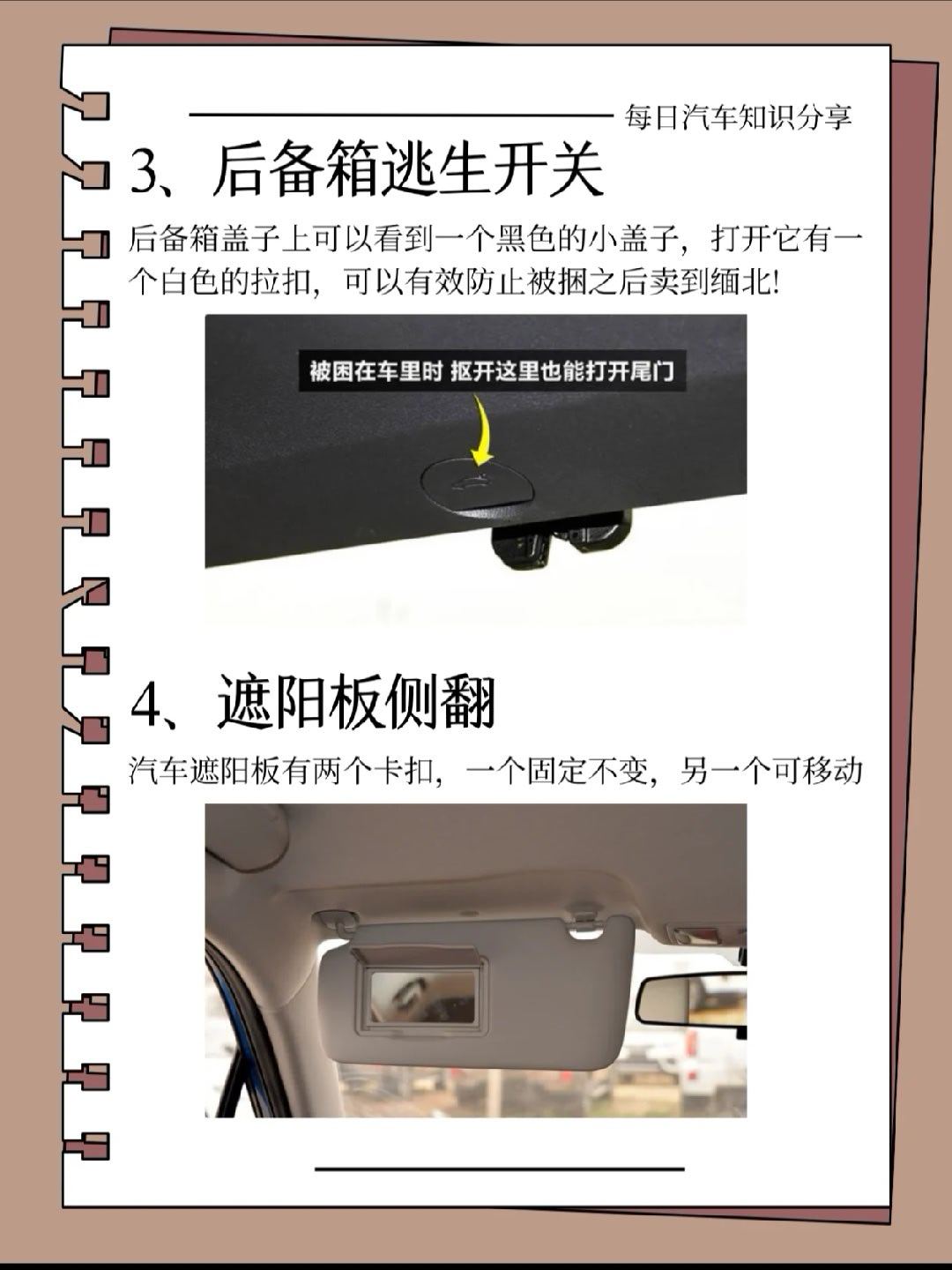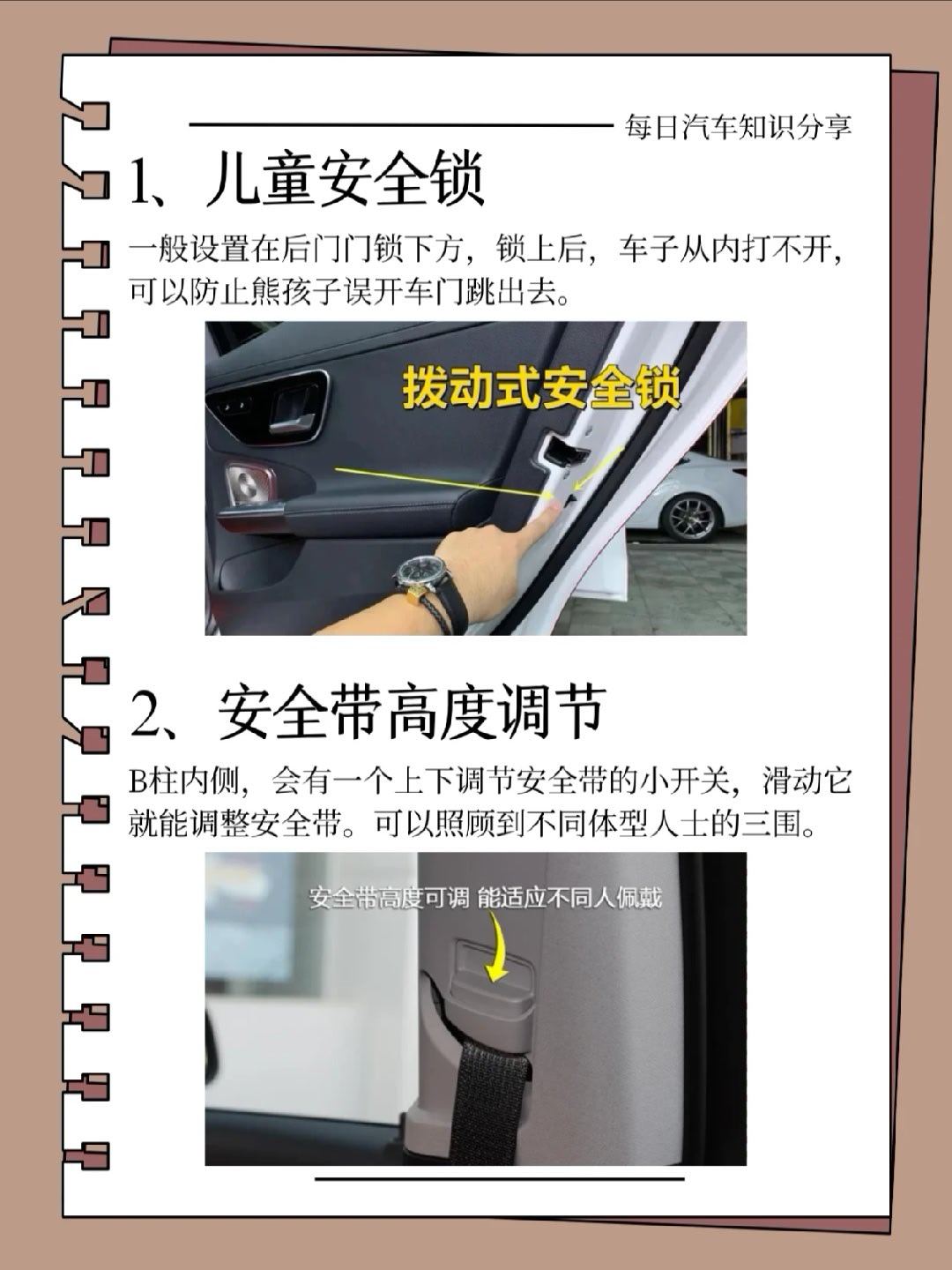 👋听说有人至今为止都不知道车子的这些隐藏功能?🌞今天就来给大家盘点一下车子5大隐藏功能!🚙学会这些,让你对你的爱车更加了解!🌹快来看!有你不知道的没!❇1. 儿童安全锁一般设置在后门门锁下方,锁上后,车子从内打不开,可以防止熊孩子误开车门跳出去。❇2. 安全带高度调节 B柱内侧,会有一个上下调节安全带的小开关,滑动它就能调整安全带。可以照顾到不同体型人士的三围。❇3. 后备箱逃生开关后备箱盖子上可以看到一个黑色的小盖子,打开它有一个白色的拉扣,可以有效防止被捆之后卖到缅北!❇4. 遮阳板侧翻汽车遮阳板有两个卡扣,一个固定不变,另一个可移动。❇5. 档位锁止解除按钮按下SHIFT LOCK按钮,或者插入机械钥匙解锁,就可以把档从P档挪出来了。我与汽车的日常 大v聊车