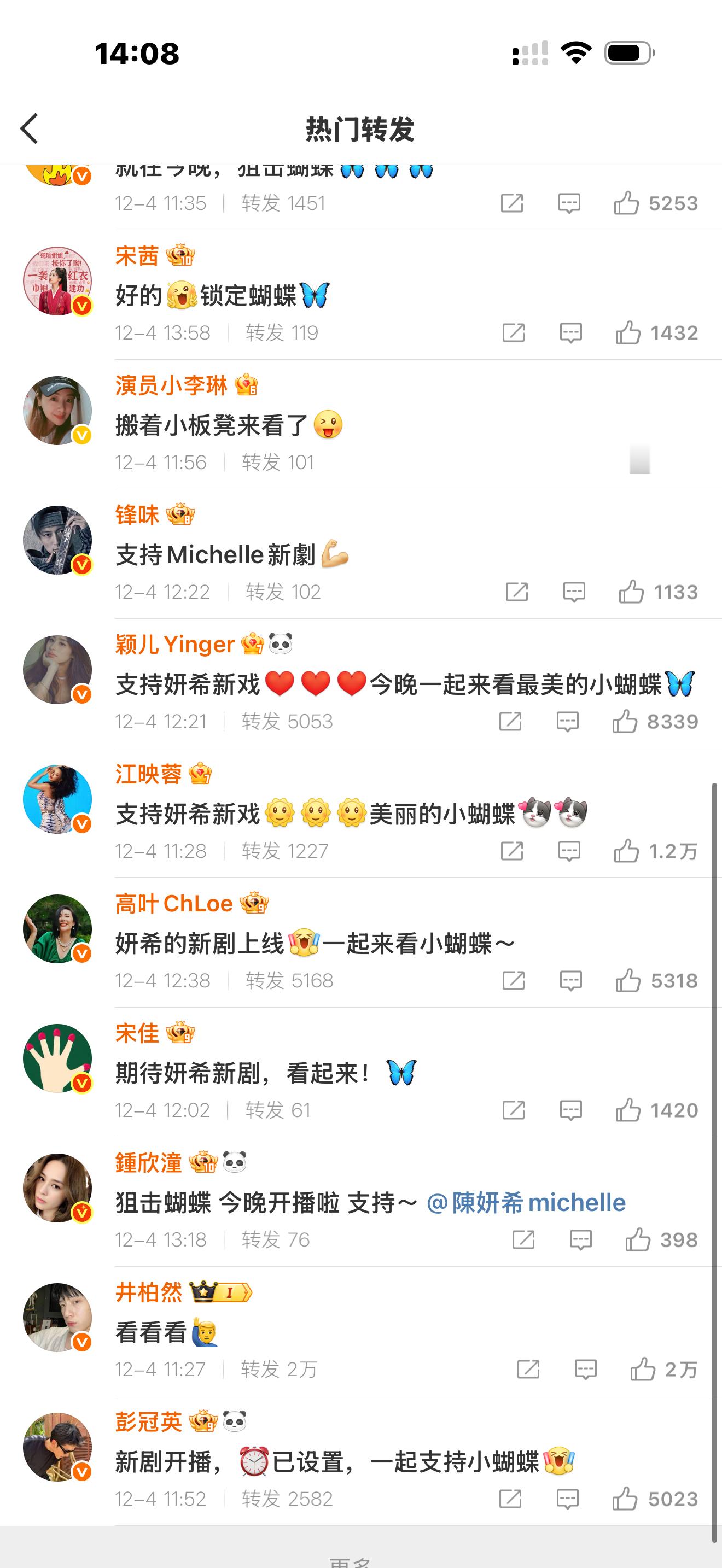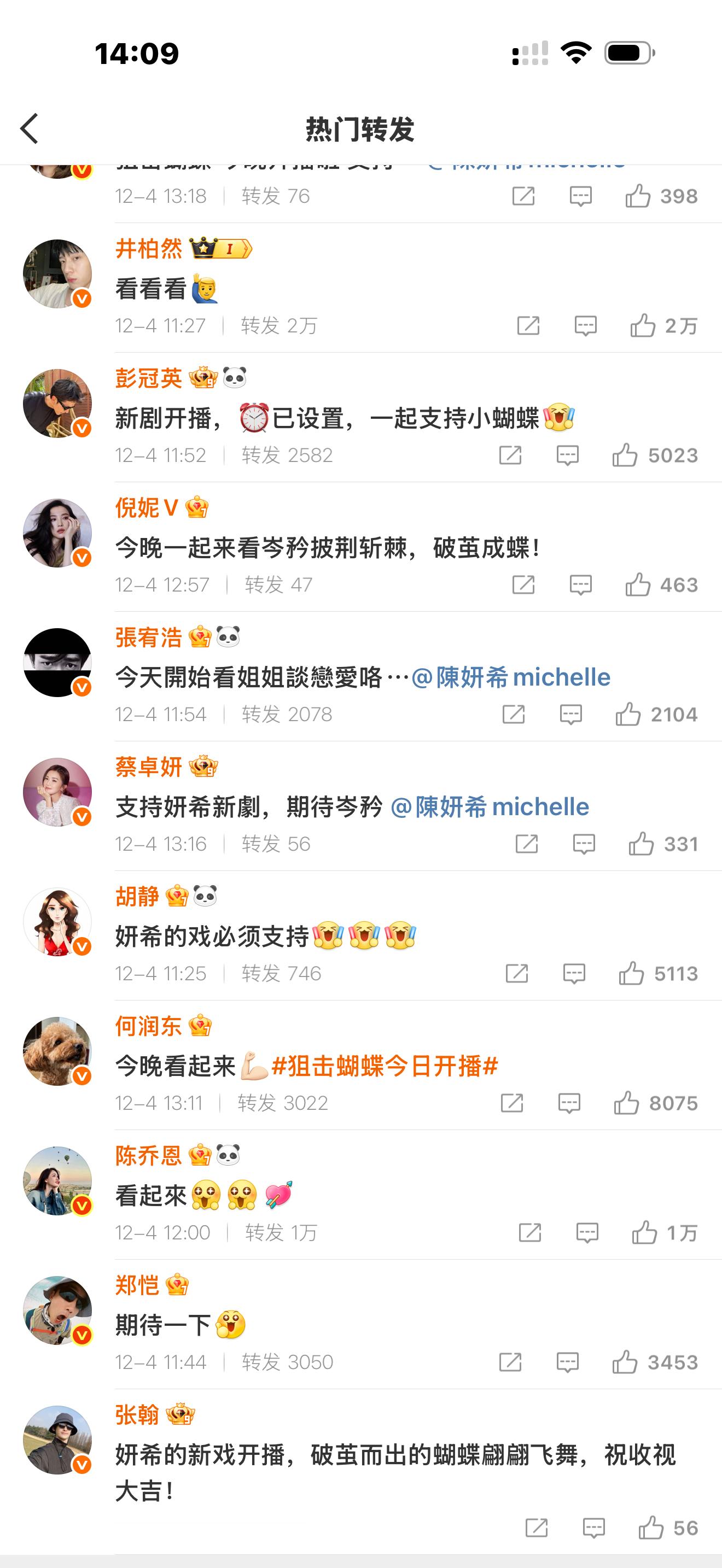 陈妍希娱乐圈人缘 微博转发区凑齐半个娱乐圈,都在为她的新剧《狙击蝴蝶》开播宣传打