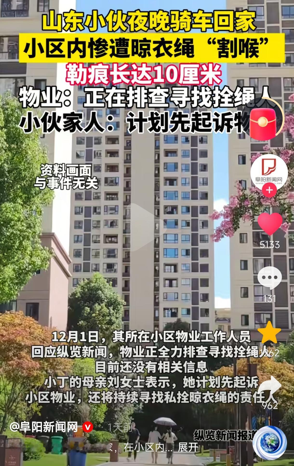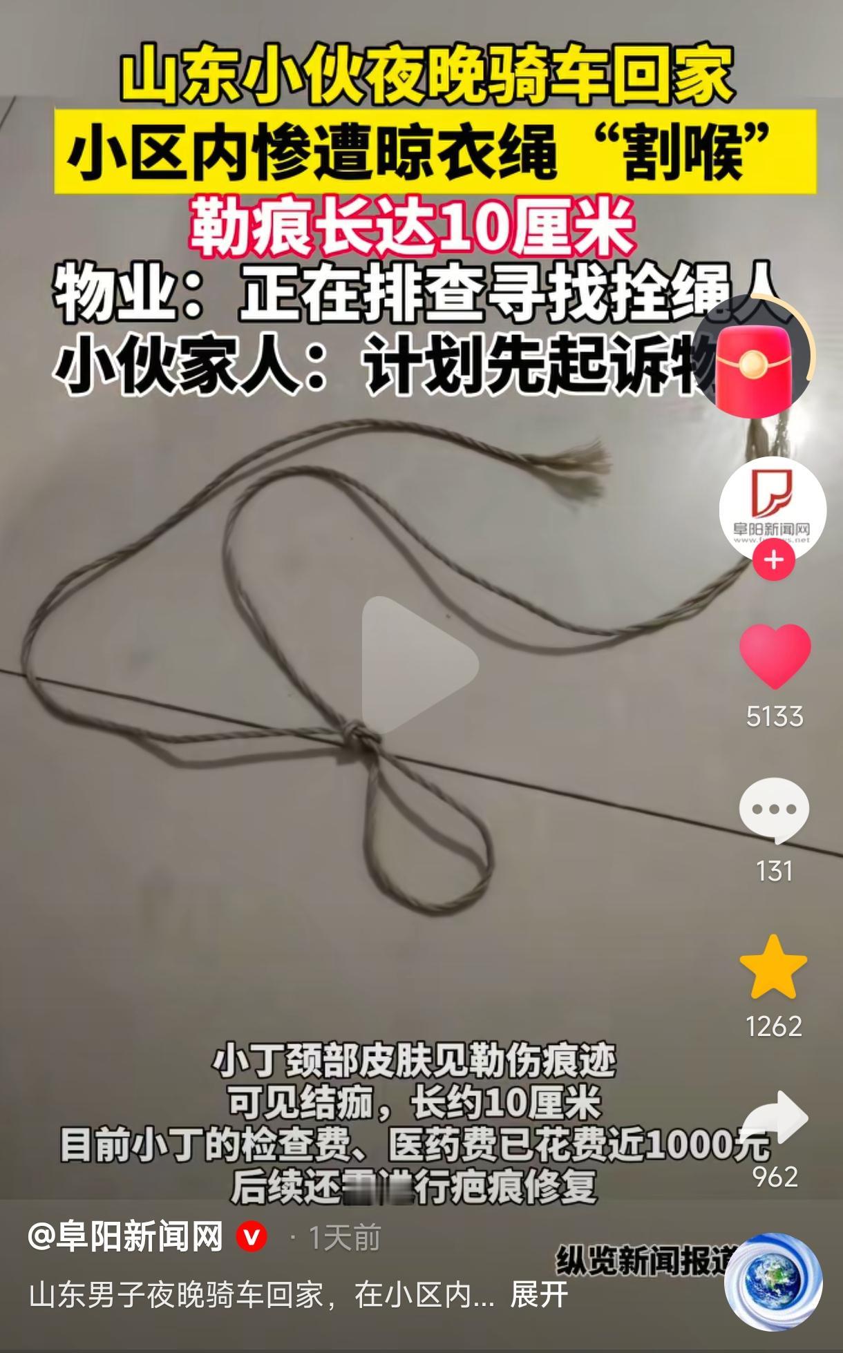 “又现夺命晾衣绳!”小伙晚上骑电瓶车回家时,被小区里私拴的一条晾衣绳“割喉”,伤口长达10厘米,送医治疗花费近1000元,后期还有疤痕修复费等,真是太惨了。 (来源:阜阳新闻网) 11月25日,山东一位20岁小伙夜间骑着电动车回家经过所住小区广场时,突然被一条晾衣绳拦住了去路,致脖子被绳子割出了一条10厘米长的血口子,鲜血淋漓。 当时因为晚间光线昏暗,加之小伙估计又是近视眼,那肯定不会留意到横在面前的“夺命”晾衣绳。说实在的,很多人白天都不一定看得到那些细绳,更何况是在夜间。 之后,小伙被送往医院救治,所花检查费、治疗费等达千元,而他的脖子也因此留下了一条明显的疤痕,毕竟人年纪轻轻的,后期小伙疤痕修复也是少不了的。 事后,小伙家人便愤慨地表示,首先起诉物业,然后再持续寻找并追究拴绳人的责任,目前小区物业正在全力追查拴绳人,以还受害小伙一个公道。 不料,物业表示他们也很无奈,小区是明令禁止私设晾衣绳的,但住户多很难管,有的人很不自觉,前脚给它清理掉了,后脚他又给拴上了。(也说明管理没到位) 物业还提到,小伙事发的那个通道为广场步行通道。其实,就算是步行通道,人走路通过时也是会有危险的,只是电瓶车速度要快一些,受伤程度也更高一些。 网友们对此,纷纷热议不止。有网友说,我们小区就有好多老人都拴了绳在步行的小路上,晚上走路有时候真看不到。 也有网友说,幸亏拉的是尼龙绳,如果是钢丝,拉得又紧,而骑行者速度又够快,触碰到了脖子就等同于故意杀R。还好,这小伙没出人命,算中不幸中的万幸了。 还有网友说,如果找不到拴绳人,就起诉全小区里的人,这跟“高空抛物”一个道理。 小伙的惨剧,无疑是拴绳人公共安全意识缺失及物业管理漏洞共同造成的,拴绳人漠视他人安危、只图自己方便乱拉晾衣绳,物业管理不到位还以管理难相推脱,二者都难辞其咎,都要承担责任。 私拉的晾衣绳,其实就是可怕的“隐形杀手”,危害太大了,它给夜间骑行者提了个醒:一定要多注意路况,以免发生飞来横祸。 而居民循规蹈矩、不私拉晾衣绳,这也才是对他人生命的尊重与敬畏。 有律师也为小伙一家支招,若找不到拴绳人,可先向物业主张赔偿,后续物业找到责任人后再追偿。如此让责任人逃无可逃,保障了小伙的合法权益。 而小伙也算是福大命大、有惊无险,若遇到的是铁丝类的晾衣绳,那结果就难以想象了。