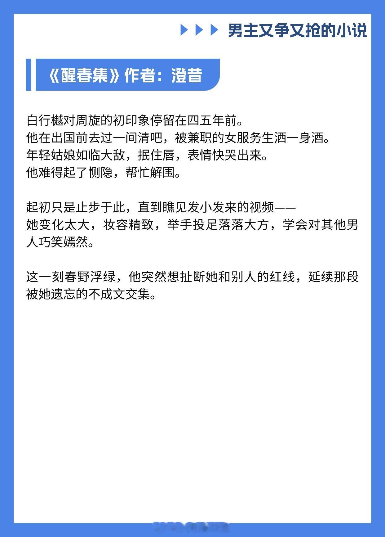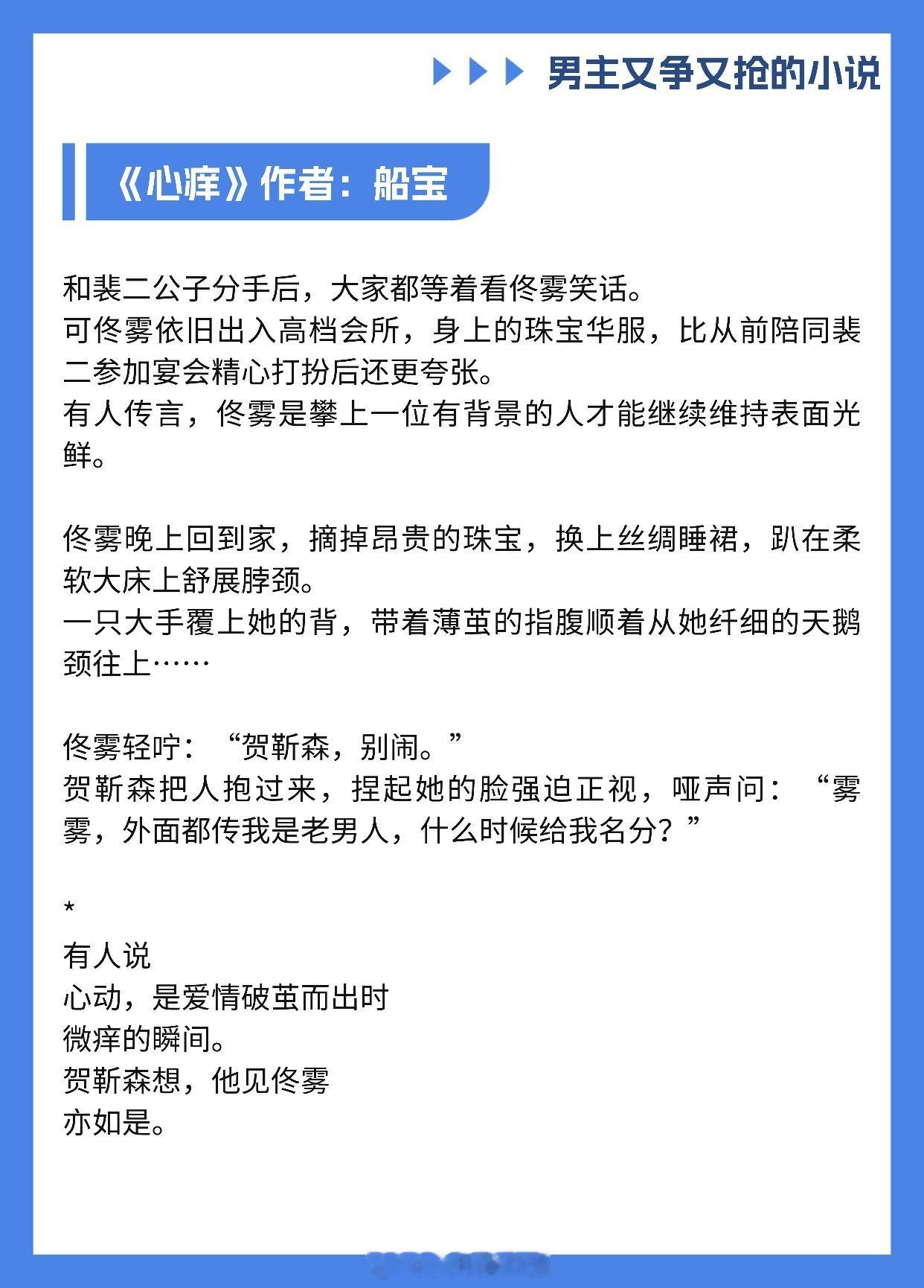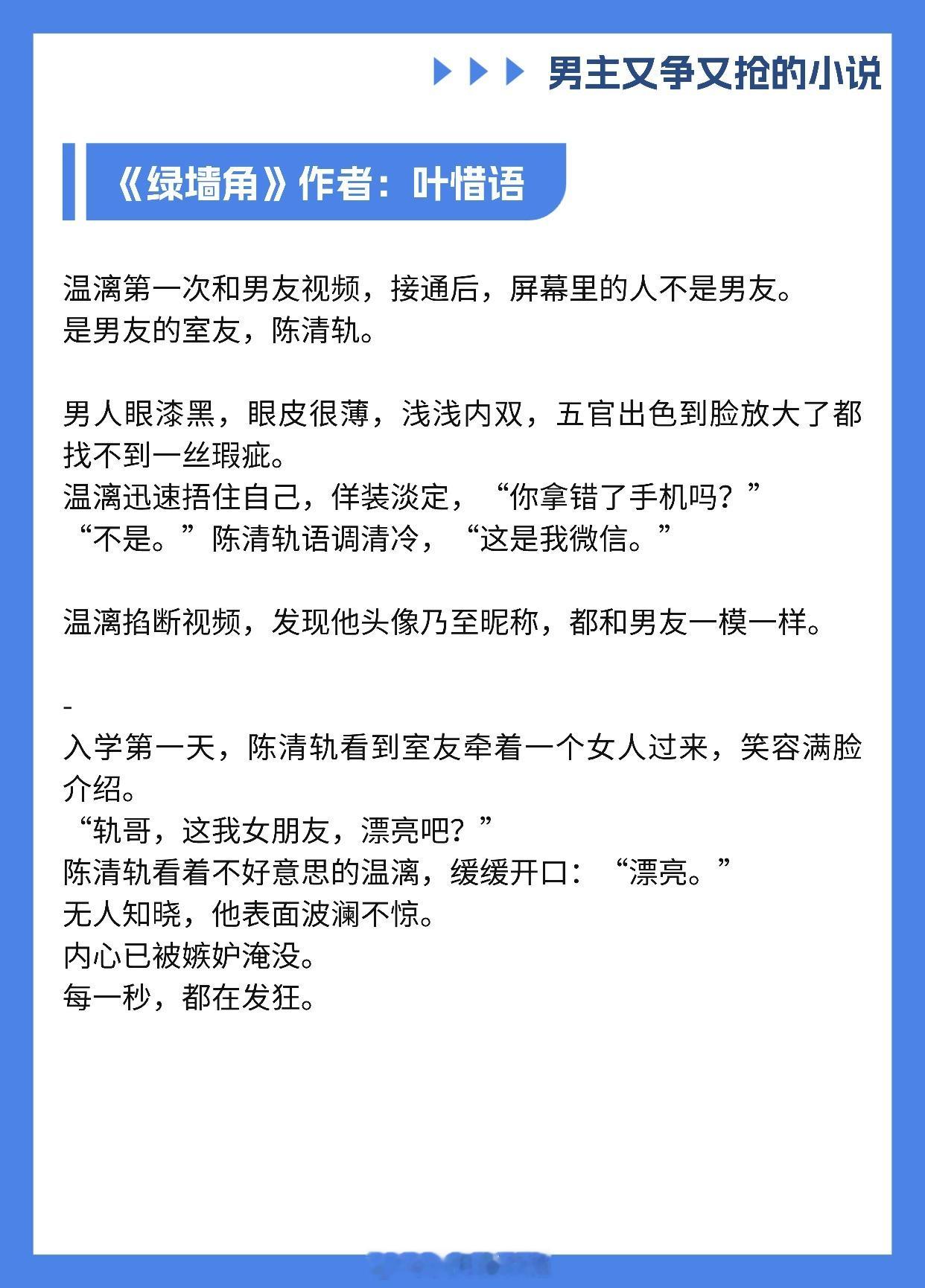 【男主又争又抢的小说】我爱你,即使这会毁了我《香波之外》作者: 核萄《涨红》作者:多梨《不入爱河》作者:蒋牧童《心痒》作者:船宝《绿墙角》作者:叶惜语《这婚离不了》作者:无影有踪《潮热》作者:今雾《世界名画》作者:老天鹅啊《醒春集》作者:澄昔推文推文言情小说推荐