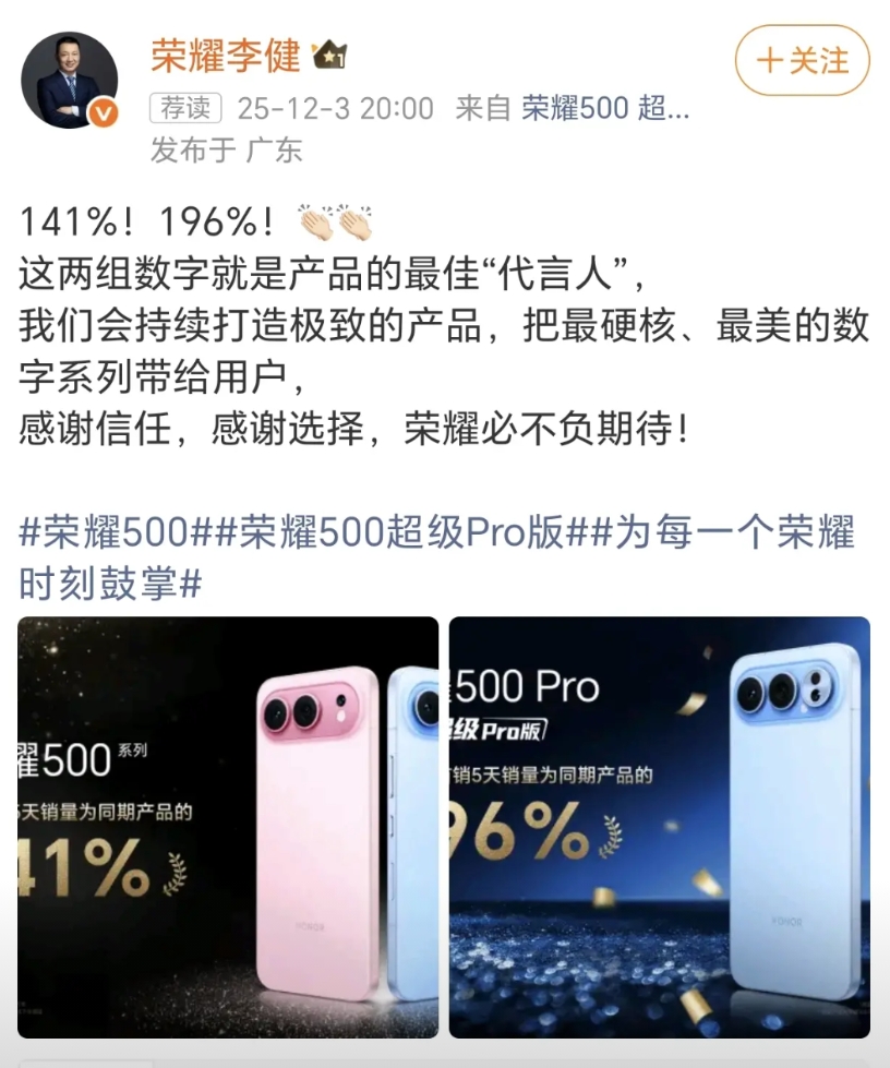 荣耀500Pro才卖了5天,销量已经是同期产品的196%!华为mate80已经瑟瑟发抖!!