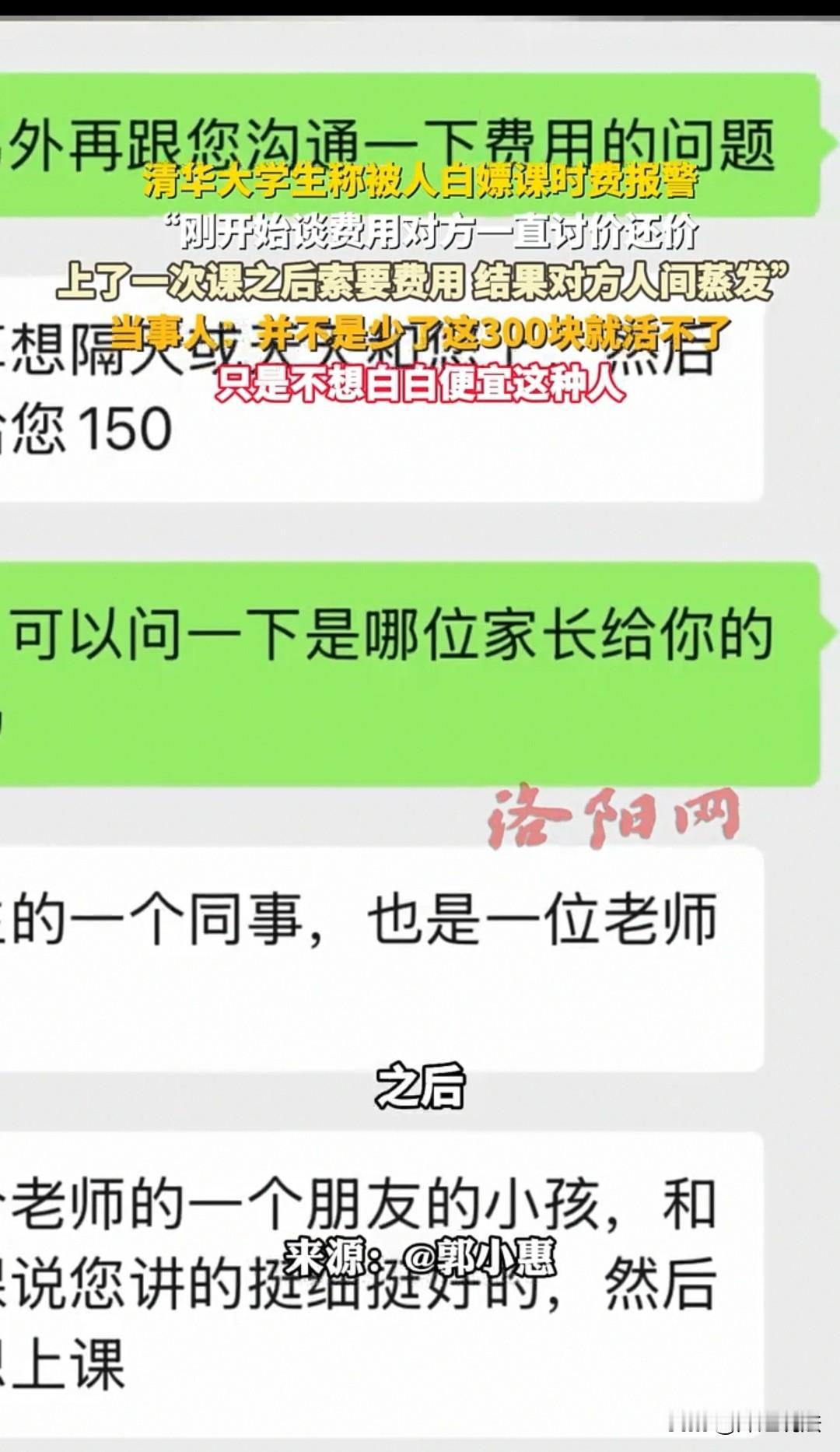北京,一位清华大学的男同学到派出所报警了,声称一位高三同学的家长请他帮忙辅导数学,说好的一个半小时300元,结果人间蒸发了。他说自己并不是非要这300元,只是不想便宜了这种人,才选择这样的处理方式。 这位男同学是清华大学的学霸,自然不用多说,他的每科成绩都特别优秀。闲暇之余,他就想找份兼职赚赚零花钱,这也是很多在校学生的一种正确选择。 男子就在线上浏览兼职信息,也留下了联系方式。不久后,就有一位沈阳的家长联系到男子,说自己的孩子正在上高三,数学有点差劲,问他能不能帮忙辅导。 男子当然高兴了,说没问题,只是我们得把报酬讲一讲。 家长说,按照市场价,一个半小时150元怎么样? 男子有点不高兴了:自己可是名牌大学的学生,怎么能和普通学校学生的辅导单价一样呢?那可不行,他直接拒绝了。 家长马上挽留男子,说那就一个半小时200元吧,你看行不? 男子还是一口拒绝了。一来他是名牌大学的学生,二来孩子是高三,辅导的是数学,所以怎么着也不该是这个价格。 最后家长没办法,直接把价格提到了300元一个半小时,男子才同意了。 双方谈妥价格后,家长就把自己孩子的学习情况通通告知了男子,让他提前拟一份教学方案,这样也不至于到时候孩子懂的还在教,没懂的又没讲到。 男子很快就明确了要从哪方面给孩子辅导,于是就约好了时间,在周一晚上开课。 到了约定的时间,双方通过腾讯会议软件上课。第一天的辅导进行得相当顺利,这一个半小时里,男子也勤勤恳恳,花了很多心思帮孩子讲解知识点、理清思路。 可到了第二天上课,才刚刚上了十几分钟,孩子的班主任打来电话,不知道有什么事情。 孩子回到会议室跟男子说,今天有事,上不了课了,我们下次再上吧。 男子说没问题,那就约下次。虽然浪费了十几分钟也没关系,毕竟谁都是从学生时代过来的,肯定是孩子遇到了特殊情况,所以他也理解,让孩子先下线处理事情。 不过孩子并没有立即退出会议,而是拿出一张试卷,问男子其中的一道题,并且问他有没有学数学的速成方式。 男子知道,高三时期的学生都比较心急,遇到不会的地方,肯定希望能有速成的方法,但数学确实没有。他直接告诉孩子,数学靠的是夯实基础,确实没有速成方法。 就这样,双方各自退出了会议室。而男子觉得,这位家长的孩子可能是想要速成的教学方式,但他觉得这种方式并不可行。 男子还害怕,以后在教学理念上会和孩子产生分歧、不同频;再加上孩子父亲一开始只报价150元,后来才涨到300元,他生怕最后在费用上再产生矛盾。 所以他干脆想,与其丢掉这个客户,不如重新去寻找高质量的客户。所谓高质量客户,就是和孩子教学理念同频,并且家长不缺钱、愿意支付高薪辅导费的人。 有了这个想法后,他就联系孩子的父亲,想先拿到周一那天的辅导费,之后再告知对方不再辅导他的孩子。 谁知道联系之后才发现,对方已经把他的电话删除了,电话打不通,对方彻底人间蒸发了。 这时男子才明白,自己被捉弄了。他抱着一颗赤子之心,真心想帮孩子教好数学、提升成绩,谁知道对方竟是如此龌龊,连300元辅导费都不想给。 男子觉得有必要报警,不是因为自己缺这300元,也不是怀疑自己的挣钱能力、赚不到这300元,而是不能容忍这种人占小便宜;再加上他也生怕其他学子再遇到这位家长,被这样的家长欺骗。 一、男子与家长构成的是劳务合同关系,男子已按约完成1.5小时辅导,家长必须支付300元报酬。 《民法典》第五百七十九条:“当事人一方未支付价款、报酬……或者不履行其他金钱债务的,对方可以请求其支付。” 双方口头约定的劳务与报酬合法有效,男子已履约,家长拒付报酬属于金钱债务违约,男子可直接请求其支付。 二、男子选择法律维权而非直接纠缠的做法十分明智,既能依法追索报酬,又能避免冲突升级。 《民法典》第五百七十七条:“当事人一方不履行合同义务或者履行合同义务不符合约定的,应当承担继续履行、采取补救措施或者赔偿损失等违约责任。” 法律明确了违约方的责任,男子通过合法途径维权,可要求家长继续履行付款义务,既高效又能规避直接冲突带来的额外风险。 对于此事,大家如何看? 素材来源,洛阳网2025年12月4日